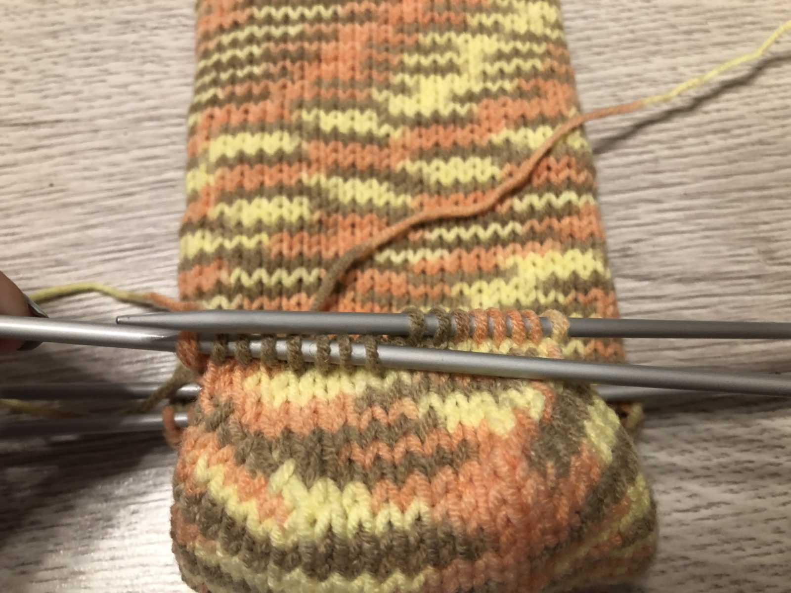 Провязав 4 см или 15 рядов, переходим к вывязыванию пятки. Здесь можно добавить к основной нити — простую нить, того же цвета. Это делают для того, чтобы пятка не быстро терлась и была прочнее.