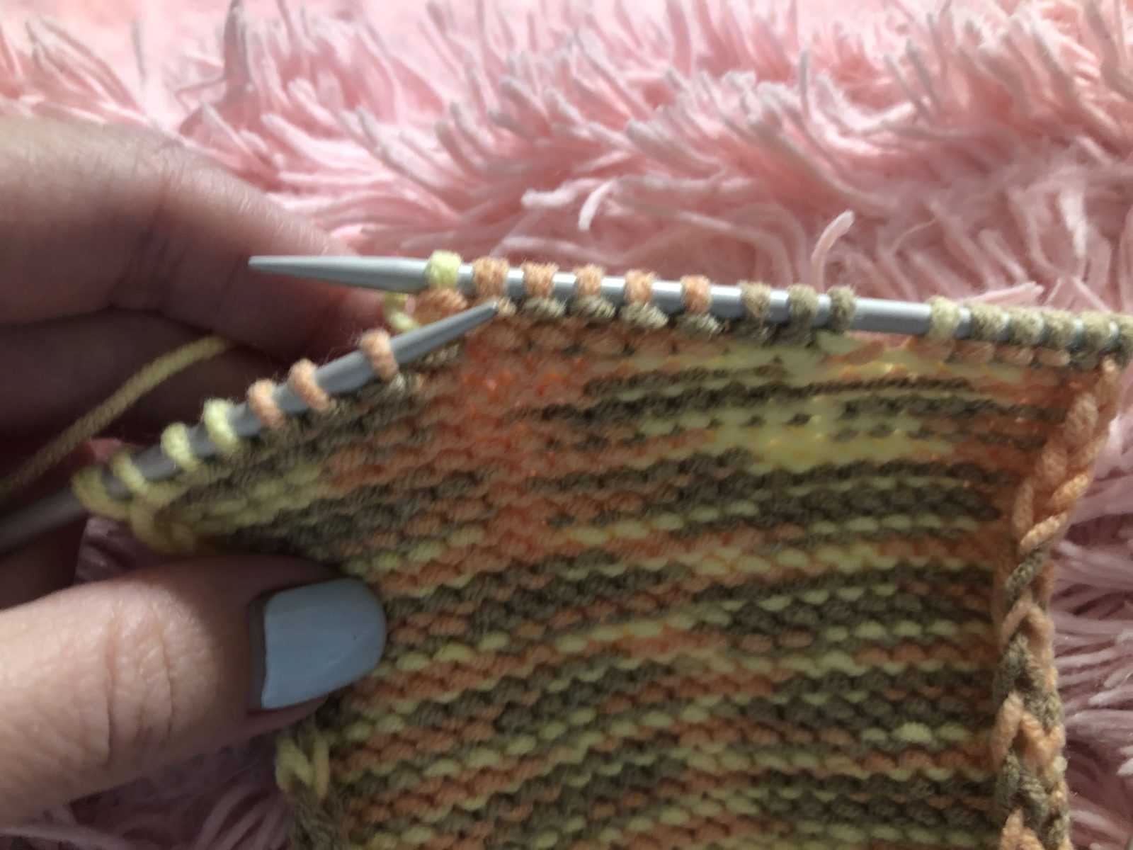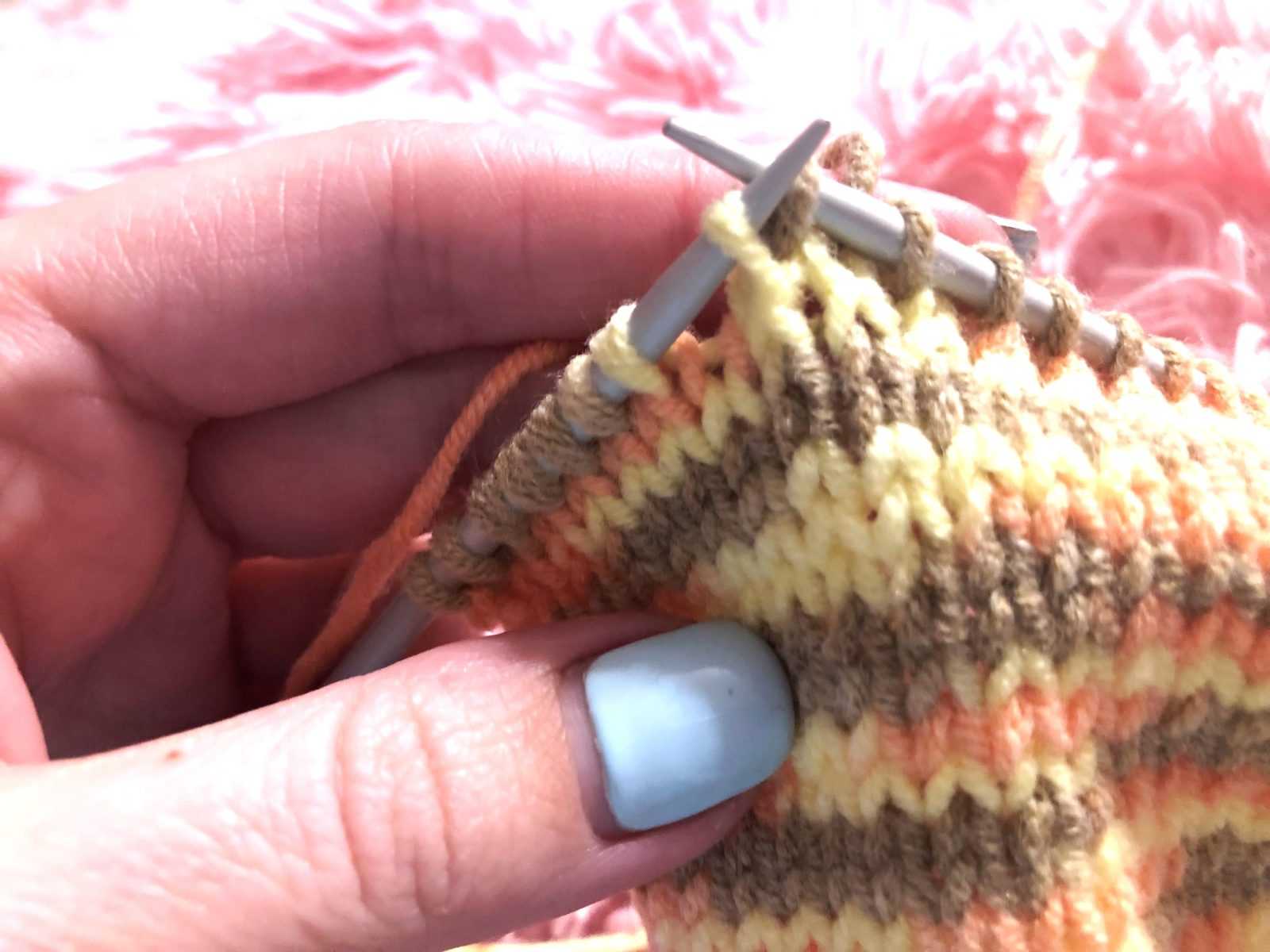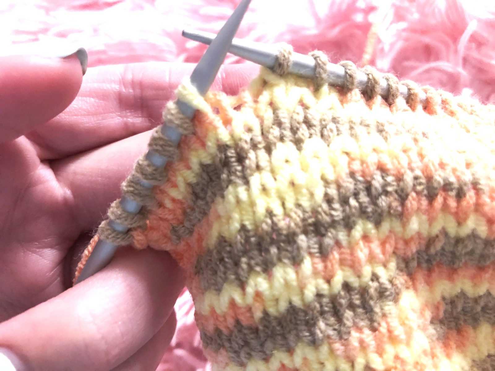 Первую петлю в начале ряда снимаем, а последнюю, вяжем — изнаночной петлей. Это нужно, чтобы образовывался красивый край.
