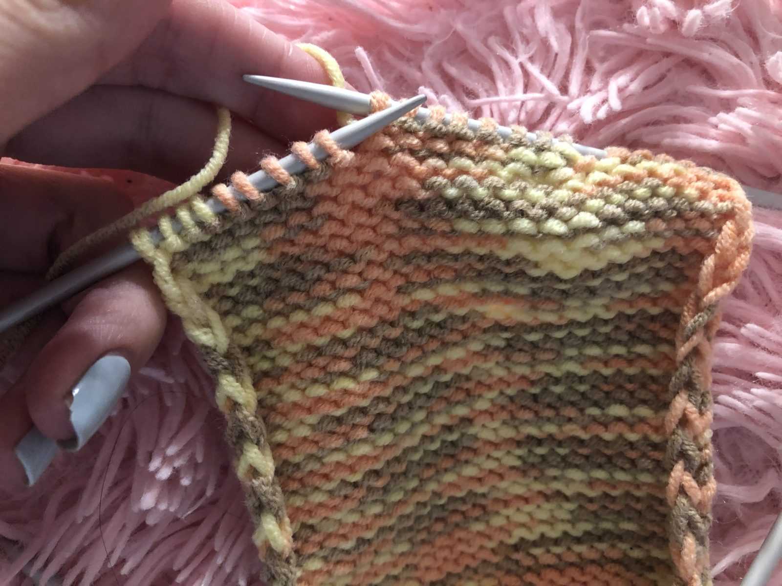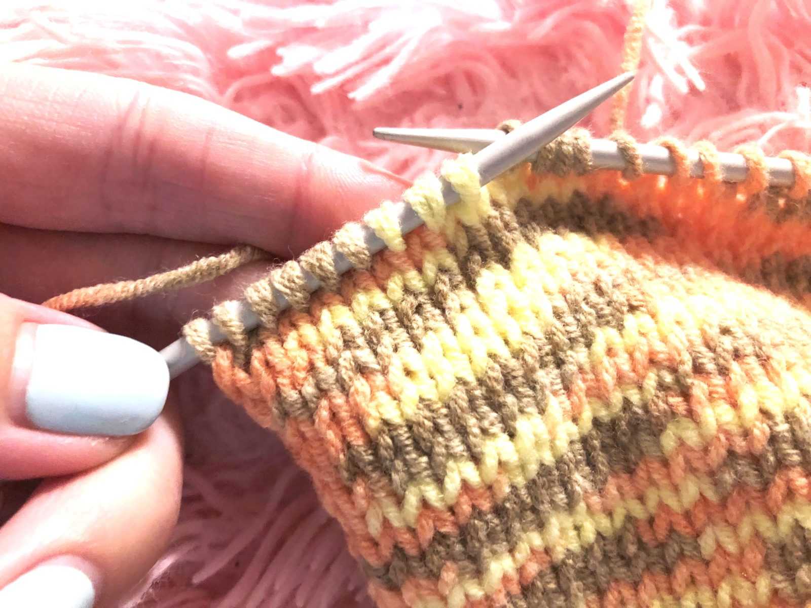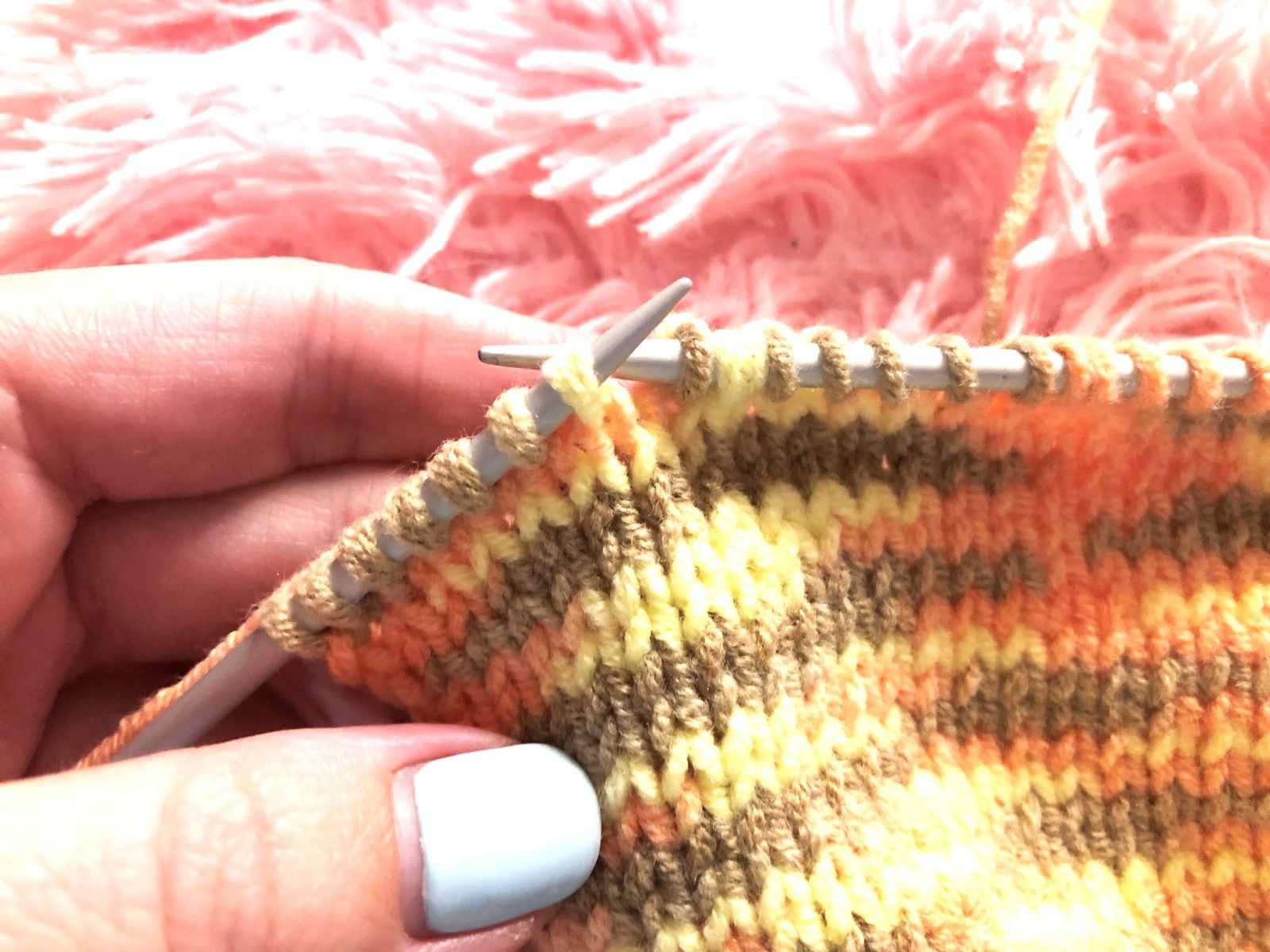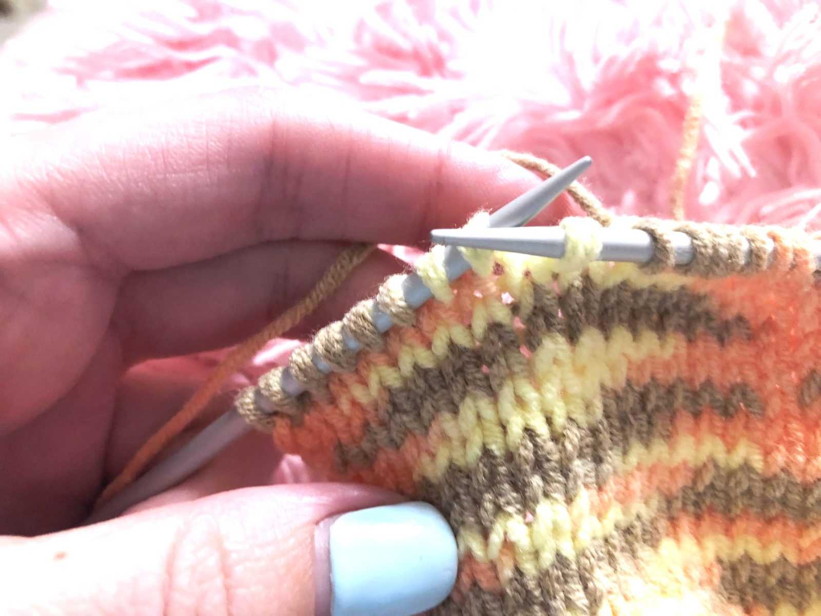 Первую петлю в начале ряда снимаем, а последнюю, вяжем — изнаночной петлей. Это нужно, чтобы образовывался красивый край.