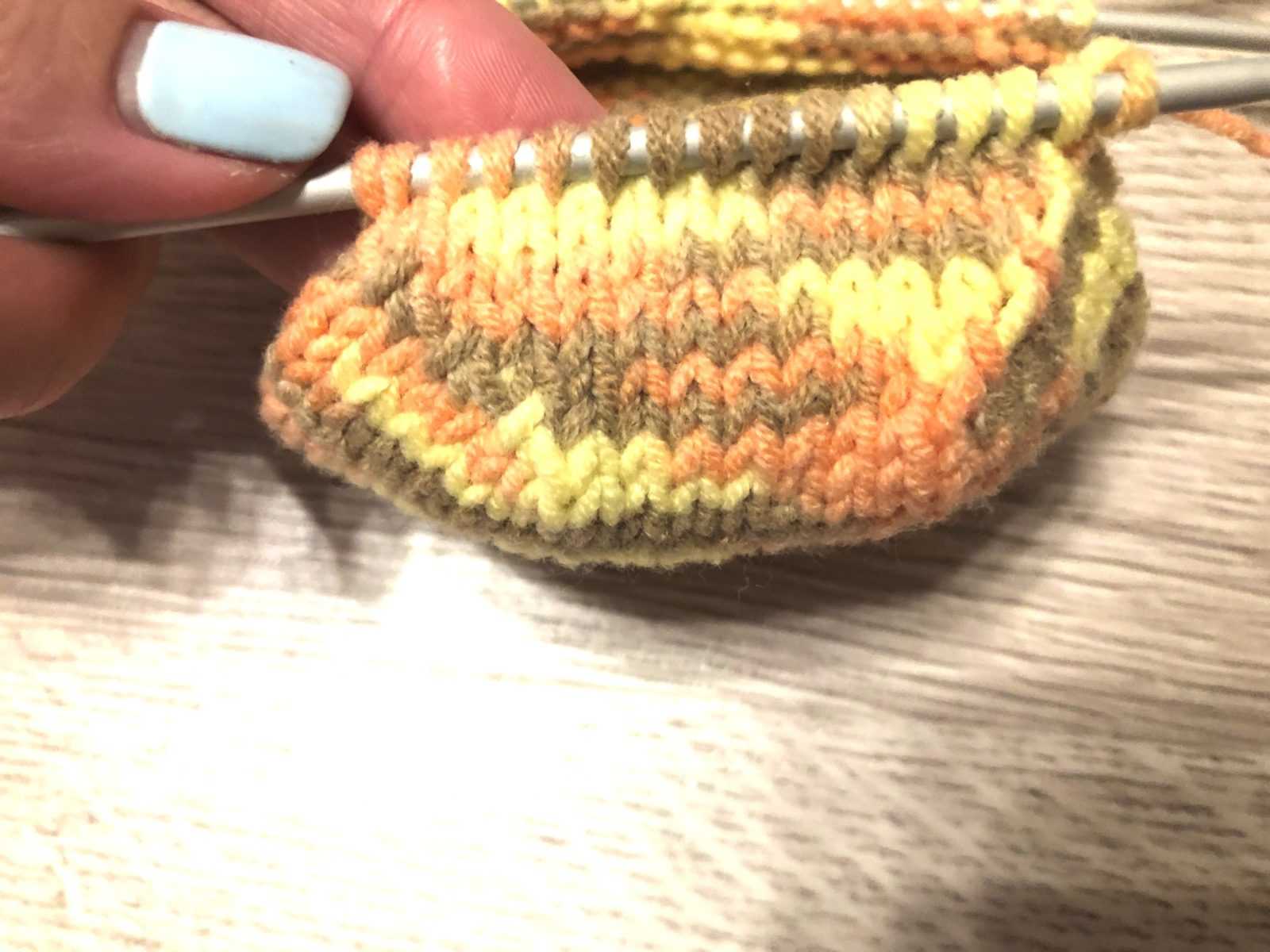 Начиная с 23 рядка выполняются убавки. В общей сложности при этом по бокам убирается по десять стежков. До достижения нужной длины при провязываются исключительно средние десять стежков. По последняя петелька при этом вяжется вместе с боковой. Таким образом удается сформировать пяточку глубиной около пяти сантиметров.
