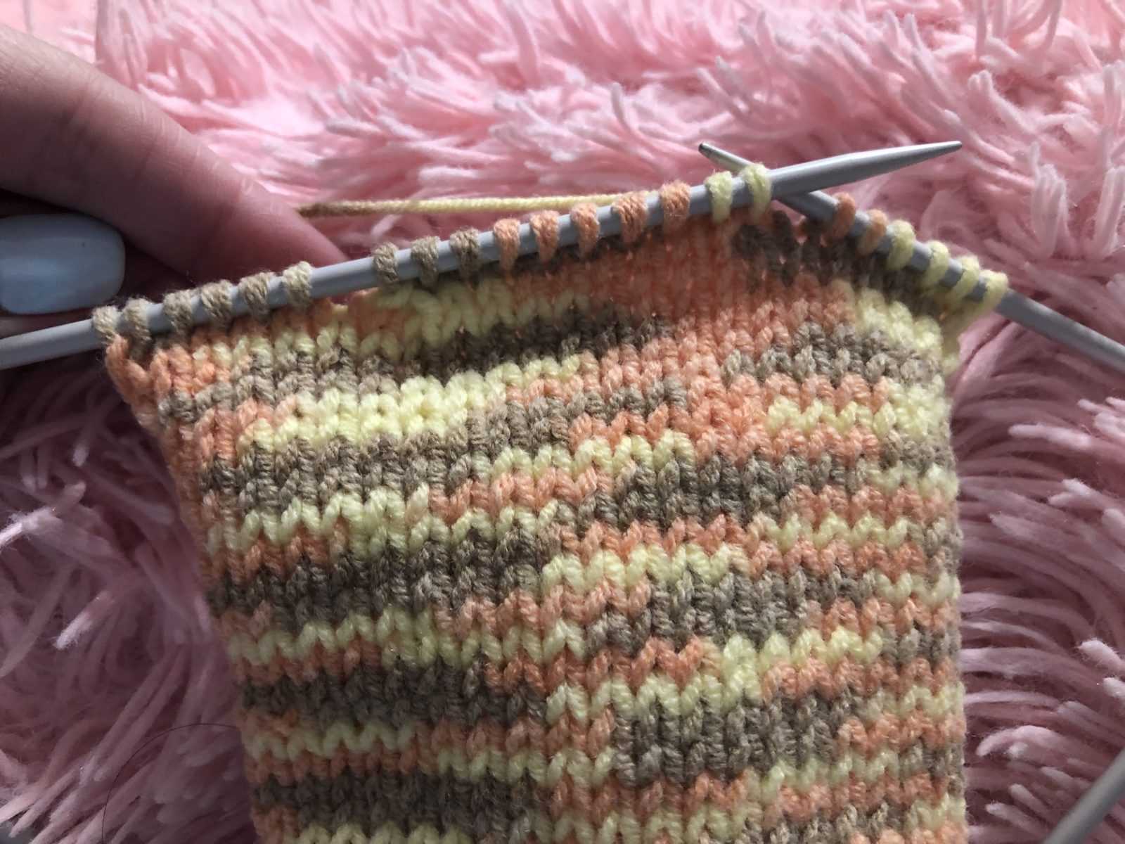 Мне нравятся высокие резинки в носках, поэтому высота моей манжеты 9 см или 30 рядов. Для красоты, я провязала розовые полоски шириной в четыре ряда.