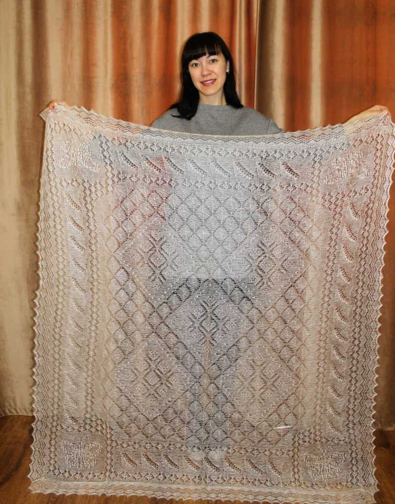 Благодаря большому размеру, он закрывает не только плечи, но и спину, драпирует фигуру фактурными складками, согревает, создает ощущение уюта. Несмотря на то что нить тонкая и плетение ажурное, палантины из пуха очень теплые.