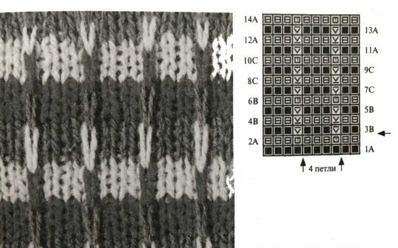 Основа схемы – резинка 3 л./2 и. Для выполнения рекомендуется использовать пряжу плотного кручения и спицы на один номер меньше, чем указано для данной пряжи.