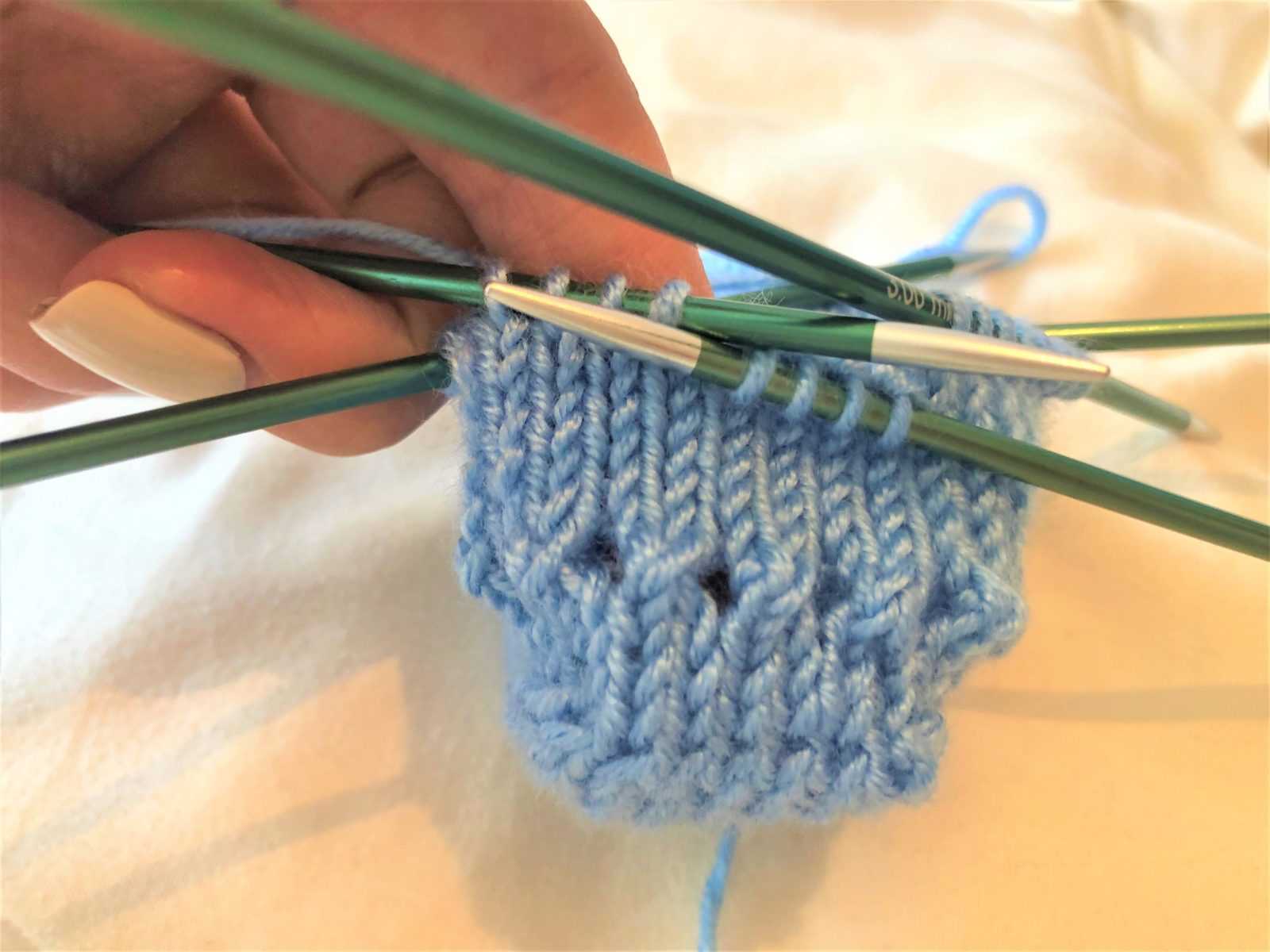 Свяжите таким образом 16 рядов. Далее в 17-ом ряду необходимо выполнить отверстия для шнурка следующим образом: сделайте накид на спицу (рис. 3), затем провяжите две петли вместе одной лицевой петлей (рис. 4), далее повторяйте накид, две петли вместе и т.д. до конца кругового ряда (рис. 5).