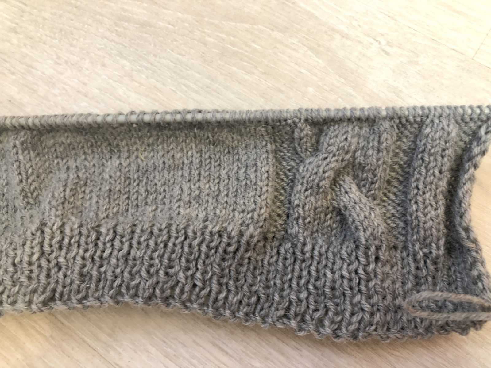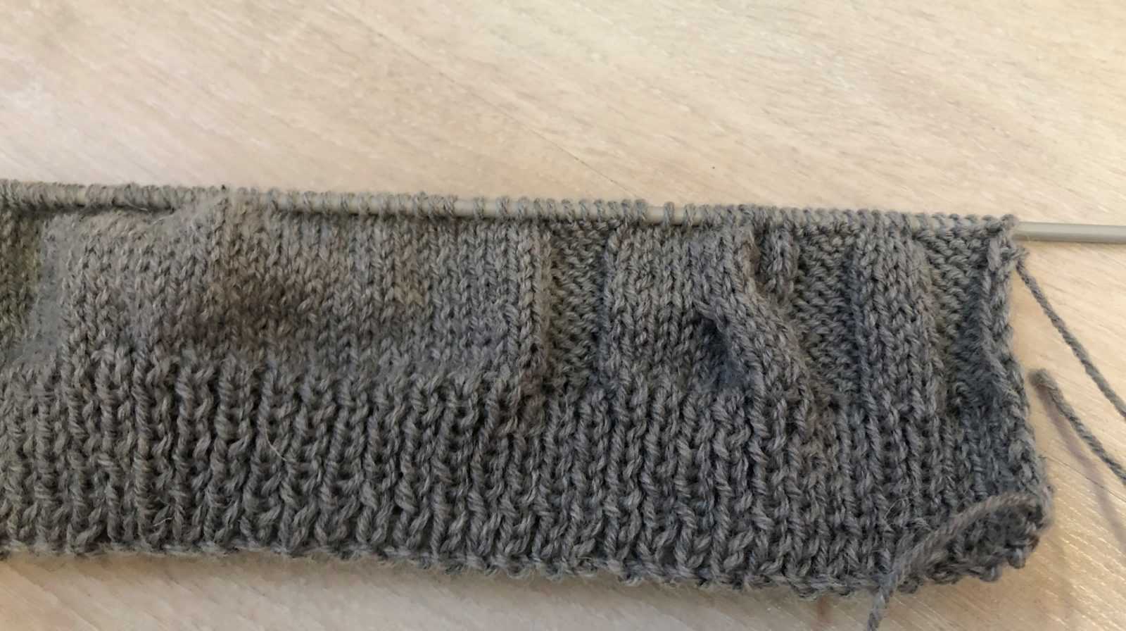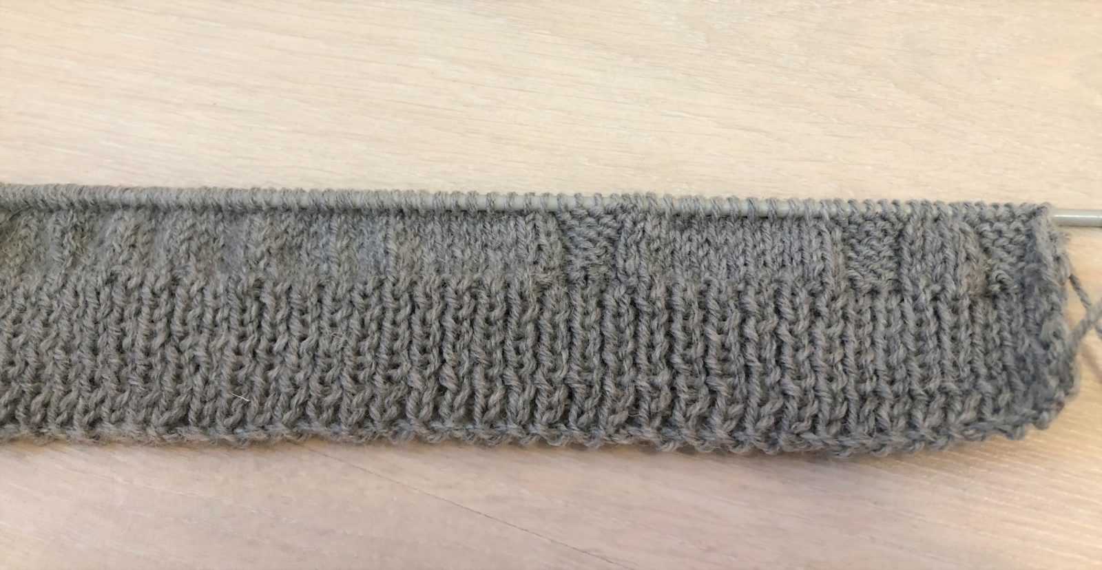 - Следующая строчка вяжется до последних 4 петель на спицах, после чего ткань переворачивается. Затем вязание возвращается к последним 4 следующим петлям от другого края ткани.