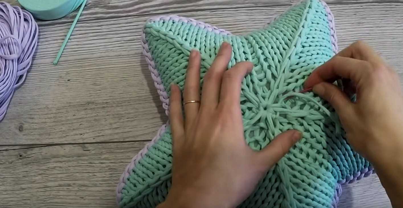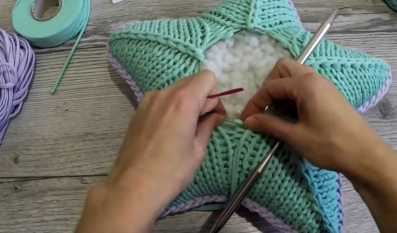 Делаем по 1 такому стежку в каждую петлю до тех пор, пока не останется один луч. Набиваем подушку наполнителем между 2 слоями подкладочной ткани