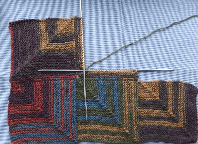 Второй квадрат готов, продолжаем вязать, формируя углы и присоединяя вязание на прямых участках