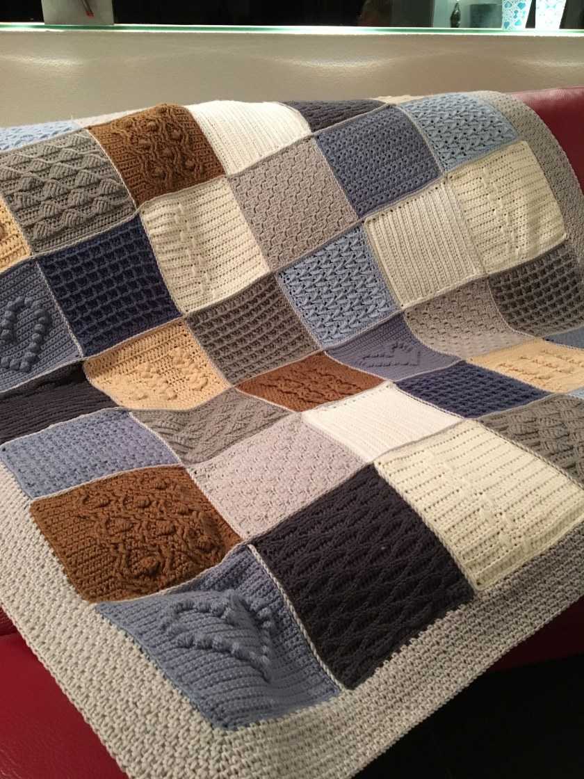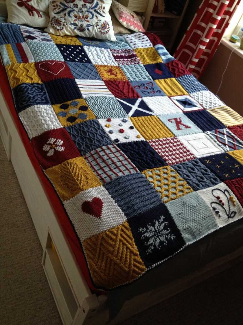 Нужно будет навязать несколько квадратов крючком или спицами и вышить их по схемам ниже, а можно и вывязать – как вам удобнее) Затем собрать все квадраты, связать их вместе и обвязать плед по краю.