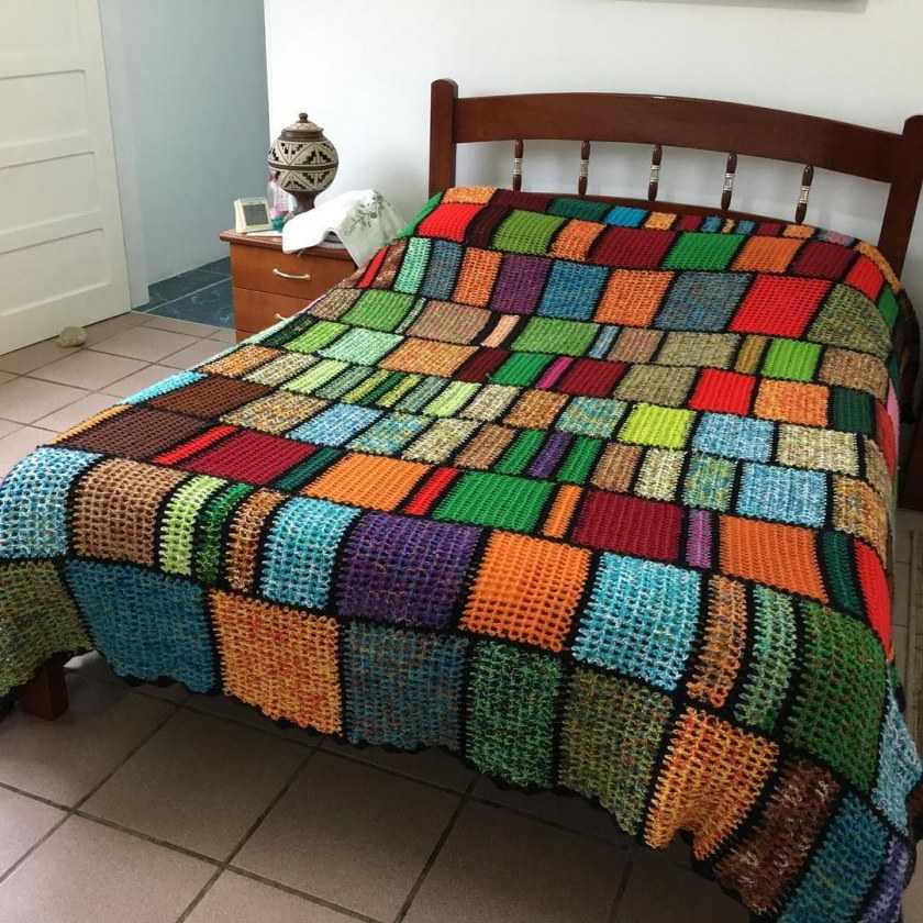 - Связывают крючком. Для этого квадраты, другие фигуры складывают в единое полотно по схеме. Два соседних элемента обвязывают по краям крючком. Для этого используют нить в тон к основному цвету или контрастную пряжу.