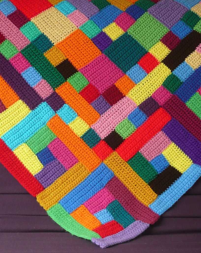 Это я к тому, что за несколько лет такой вязальной практики у меня собралось огромное количество оставшихся ниточек – три огромные коробки с клубочками разных ниток. Их некуда использовать, а они все набираются. Увидев этот плед, я испытала огромную радость – ведь это прекрасный выход опустошить дом от того, что мешается годами.