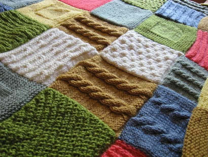 Можно связать плед цельным полотном, а можно из разных квадратиков, которые потом сшиваются между собой, или из полос.