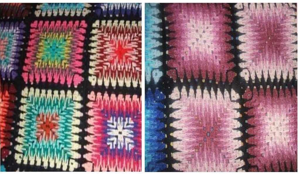 Испанский или бабушкин квадрат содержит вытянутые петли из каждой третьей линии – после группы из трех столбиков с накидами в воздушные на две ниже. Яркие сочные краски превращают красивый и теплый плед в оригинальный.