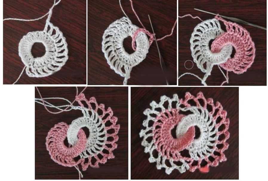 Мотив реализовывают из колец, соединенных за короткую область. Одно колечко формируют из столбцов без накида, цепочку для второго кольца вводят под уже сформированное. Их переплетают между собой, а потом обвязывают столбиками с накидом.