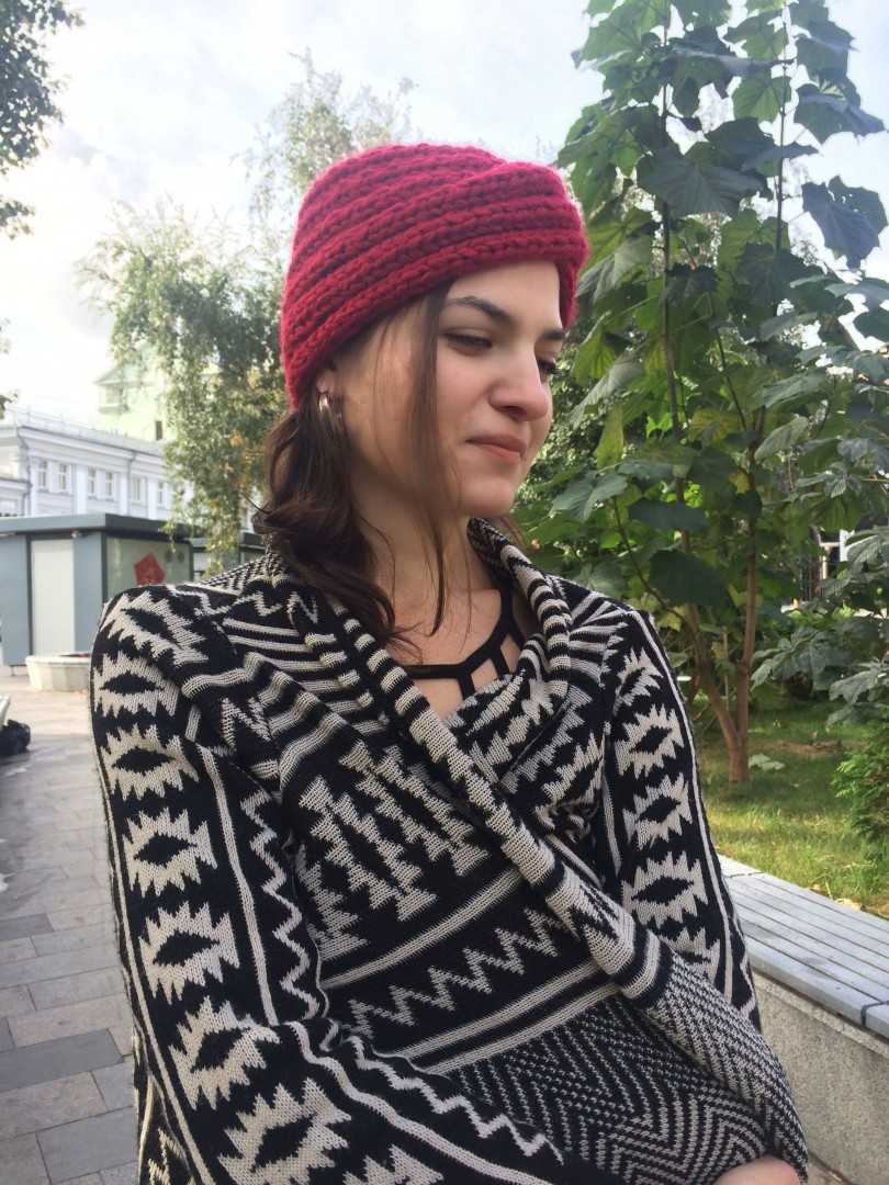 Особенно популярное изделие, подходящее для любой возрастной категории. По внешнему виду напоминает чалму. Кажется, что оно повязывается на голову узелком. Перехлест смотрится красиво, из какой бы пряжи он ни был выполнен.