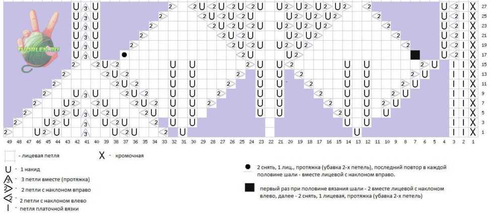 На схеме указаны только нечетные ряды шали. В четных рядах петли провязываются изнаночными.