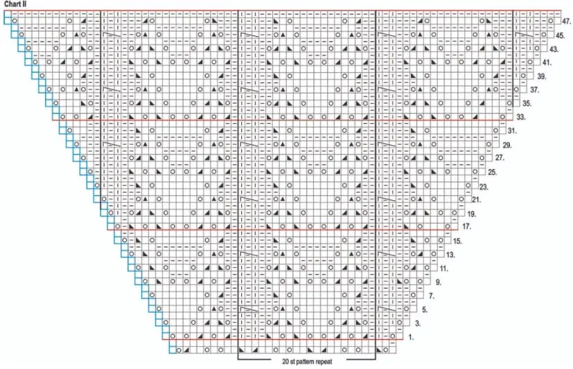 Начало вязание от центра шали с самой ее широкой стороны с постоянным прибавлением петель по рисунку. Для таких шалей можно использовать специальные схемы узора для шали с расчетом прибавлений.