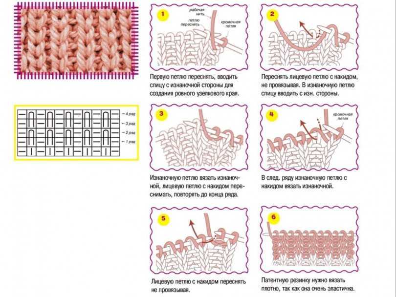 На 7 ряду такой вязки делаем перехлесты в месте с 6лп. Это можно сделать с помощью зубочисток, попеременно провязывая нужные части. Потом продолжаем идти по узору 2ип + 2лп + 2ип и снова перехлесты.