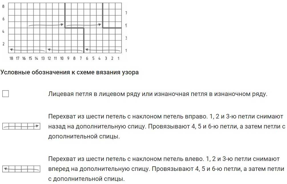 1р.: лицев.п.; 2 и все четные: по рисунку; 3р.: 3лиц., * 3п. снимите на вспом.сп. за работой, 3 лиц., петли с вспом.сп. провяжите лиц. * — повторяйте до конца 5р.: * 3п. снимите на вспомог.сп. перед работой, 3лиц., петли со вспомог.спицы провяжите лиц. *