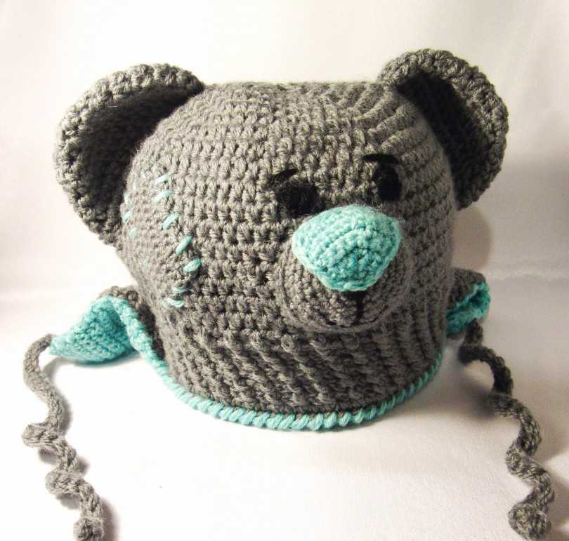 Контуры рисунка вышиваются с помощью сиреневых и черных ниток. Для того же, чтобы мишка был более реалистичный, делается глазик, в качестве которого используется бусинка. Дополнительно шапочки даже для новорожденных мальчиков украшаются помпоном. Его изготавливают из голубой и белой пряжи, пришивают в области макушки.