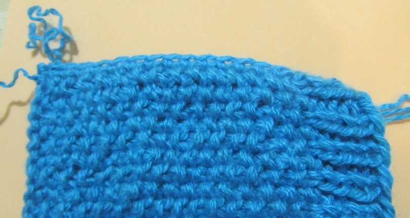 - Далее, по принципу носочной пятки, необходимо вывязать затылок. Для этого работу следует продолжать только на петлях центрального сектора (вяжут при этом лицевой гладью). В каждом ряду последнюю петлю центрального сектора провязывать вместе с ближайшей боковой, после чего полотно разворачивать и переходить к следующему ряду. Одновременно с этим для сужения затылочной части в каждом 8 ряду провязать 3 раза по 2 петли вместе.