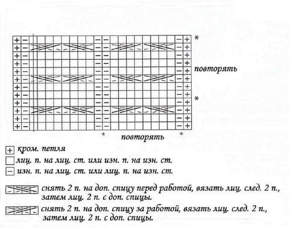 1-й ряд плетеного узора: *2 изн, 4 лиц, 2 изн, 4 лиц.* – повторяем раппорт 8 раз. 2-й р: как 1-й. 3-й р: как 1-й. 4-й р: как 1-й. 5-й р: *2 изн, 4 лиц, 6 изн.* – повтор раппорта 8 раз. 6-й, 7-й, и 8-й р.: как 5-й. 9-й: *2 изн, 4 лиц, 2 изн, 4 лиц* – повтор 8 раз. 10-й и 11-й – как 9-й. 13-й, 14-й, 15-й: *8 изн, 4 лиц* – повтор 8 раз. С 16-го р. начинается повтор рисунка.