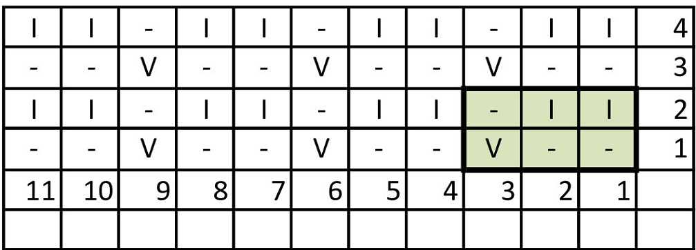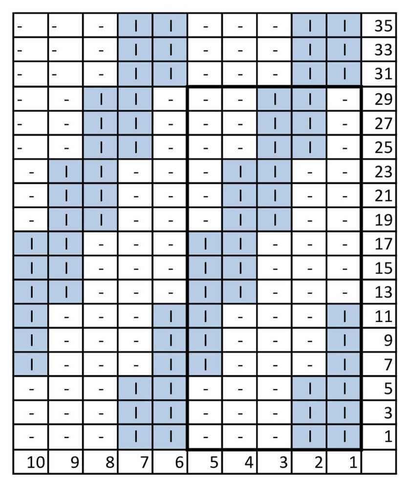 Узор состоит из полосок обыкновенной шахматки размером пять на четыре, как видно из условных обозначений. Кроме этих полосок, в узоре присутствуют бантики из изнаночных петель на фоне лицевой глади. Раппорт рельефа составляет девять П по горизонтали, и десять Р по вертикали.
