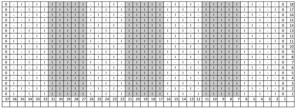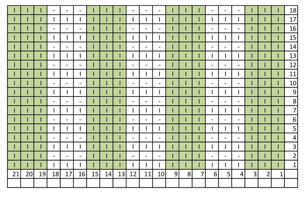Эти полосы как будто соединяются друг с другом при помощи маленьких косичек, размещенных на полотне в шахматном порядке. Схема содержит исключительно нечетные лицевые Р, а изнаночные Р выполняются так, как смотрят петельки.