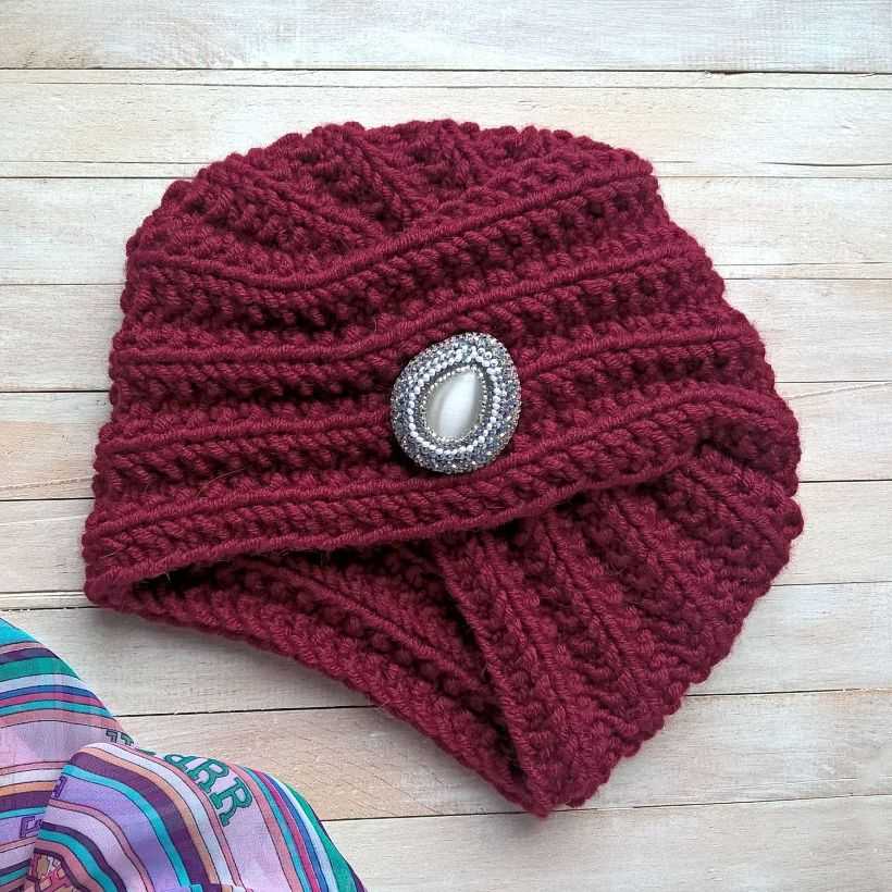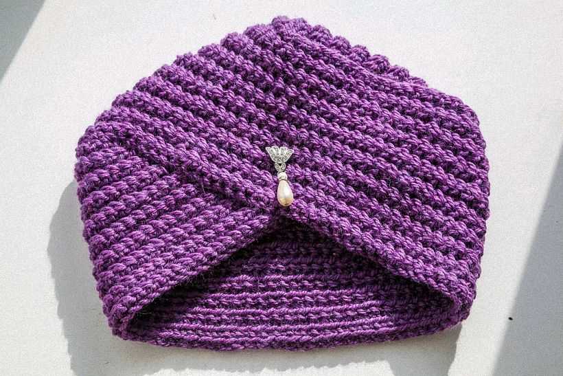 Шапка-чалма в исполнении сложнее, чем повязка. Она закрывает верхнюю часть головы, защищая от холода. Ее вяжут разными узорами, оформляя в районе лба замысловатое переплетение, которое отличает чалму от других головных уборов.