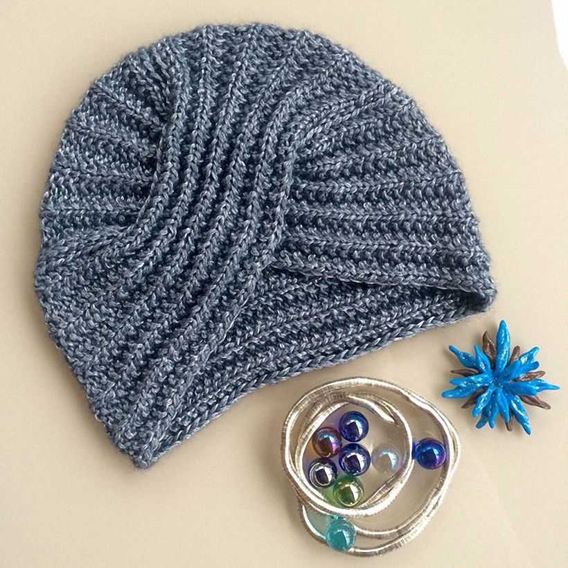 Любительницам объемных головных уборов можно связать оригинальную шапочку в форме пышного тюрбана. Полотно вяжется с расширением: между ребрами английской или другой объемной резинки сначала убавляются, а затем добавляются петли. Начинается шапка с 5 рельефных рядов, петли прибавляются в каждом каждые 4 ряда.