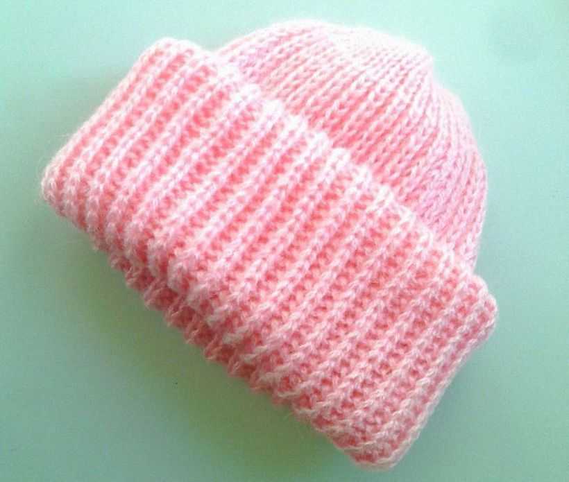 Развернув работу, начинаем вязать второй ряд. Кромочная петелька снимается, и следующие две перекрещиваются в качестве изнаночных. Перекрещивающиеся изнаночные петельки разделяются одной лицевой. Таким образом работа продолжается до завершения ряда. Дальше первый и второй ряды чередуются до тех пор, пока вы не получите резинку требуемой длины. Создается узор, одинаково выглядящий как с лицевой, так и с изнаночной стороны. Шапка, французской резинкой связанная, получается очень красивой.