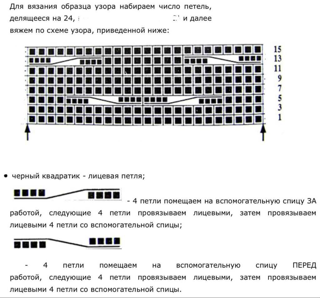 Плотность вязания узора с “косами” – 22 п. / 24 р. В 1 см. – 2,2 п.