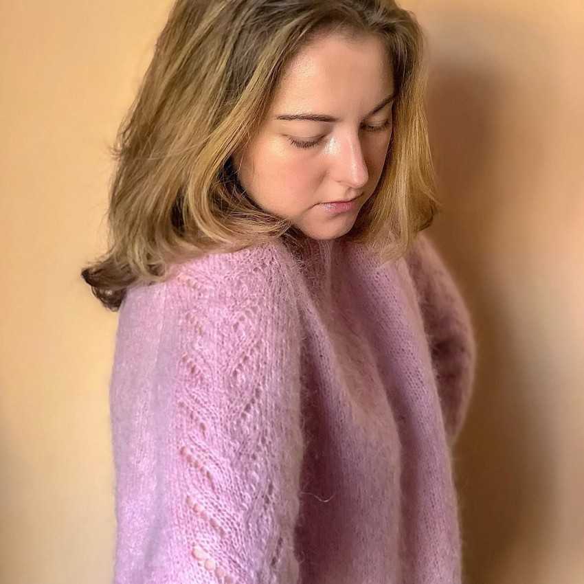 Последний тренд в вязании свитеров – эффект порванной вещи или распущенной нити, так называемая лакшери рвань. Мохер хорошо смотрится в косах, причем в косах больших и объемных. Эта пряжа любит эксперименты в разном диаметре спиц и вывязывании сложных узоров.