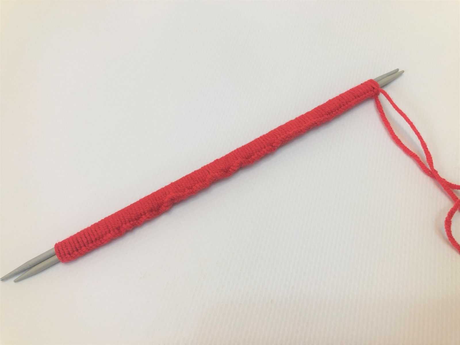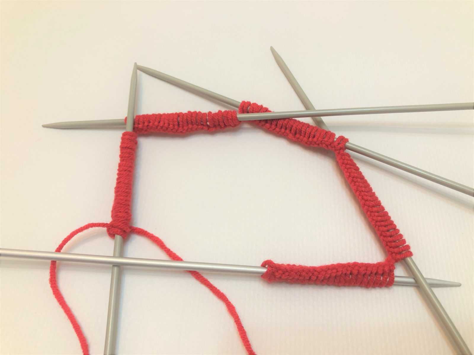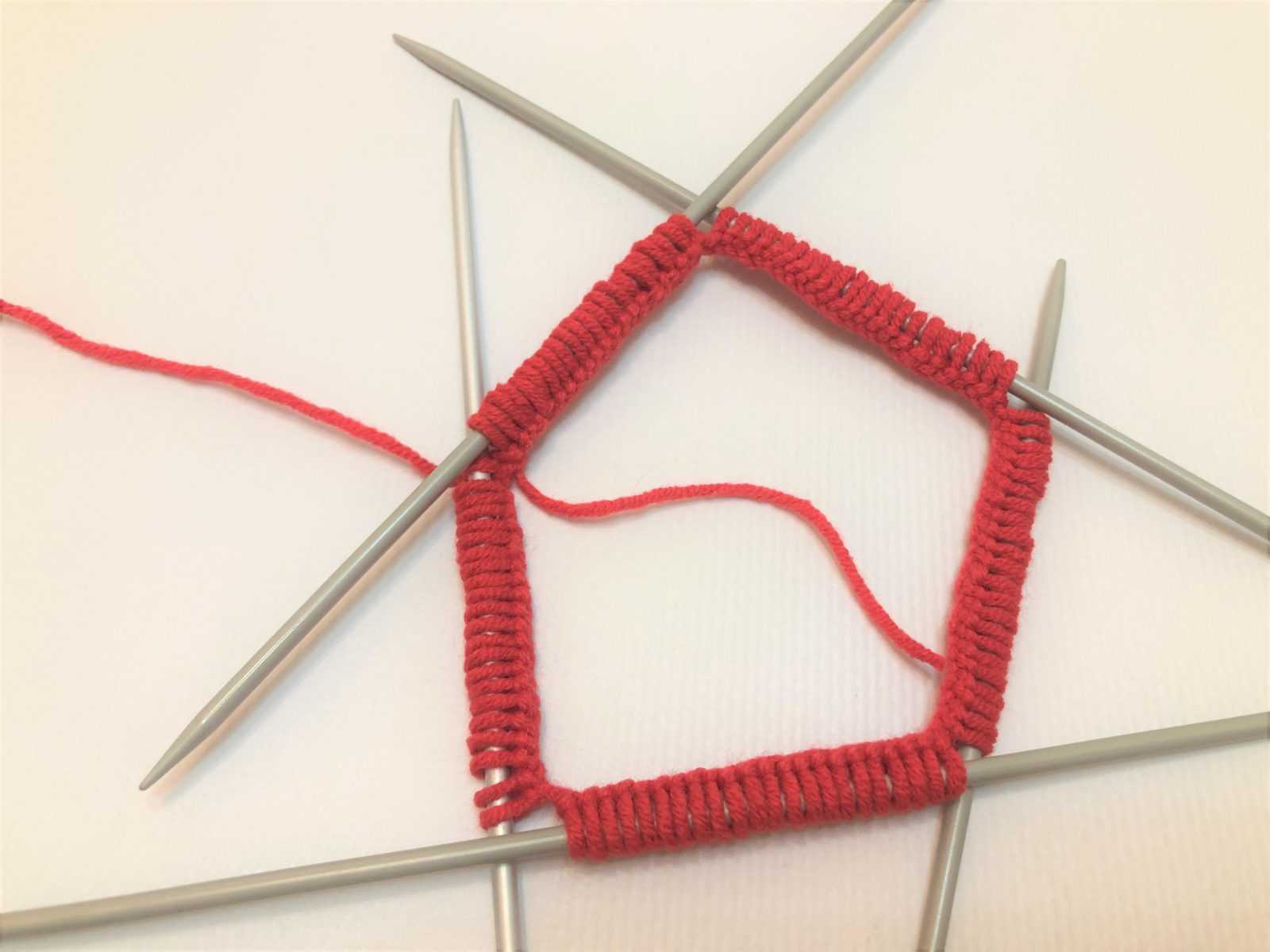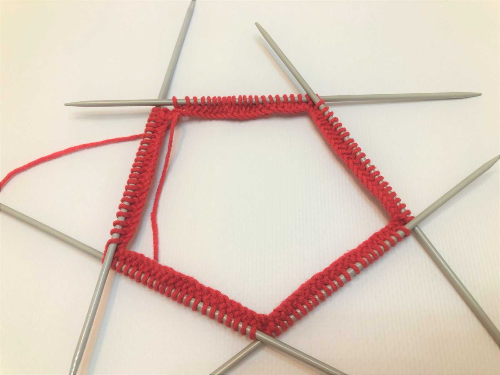 Распределяем по 22 петли на 5 спиц. Если спицы короткие, можно набирать сразу на каждую из пяти спиц по 22 петли.