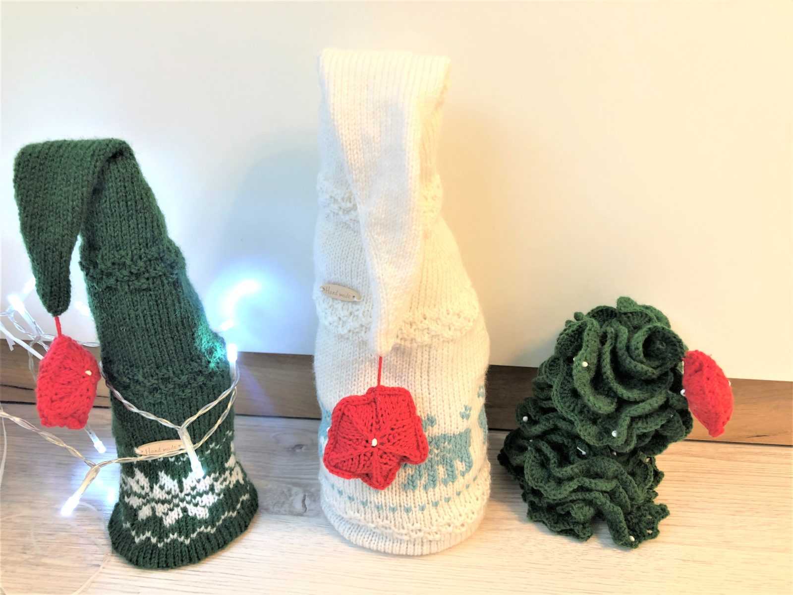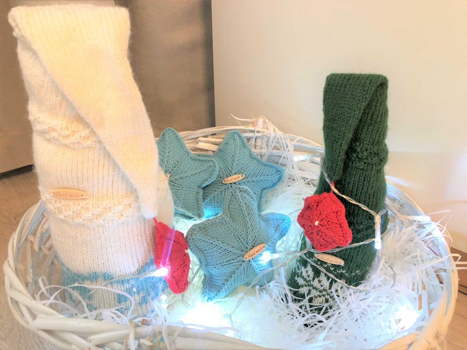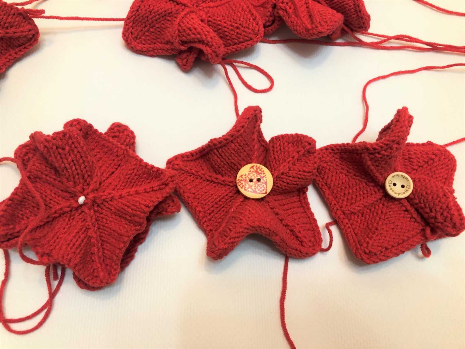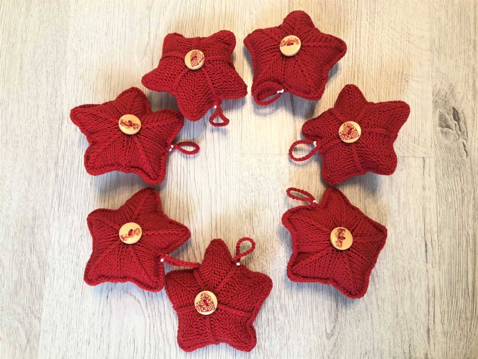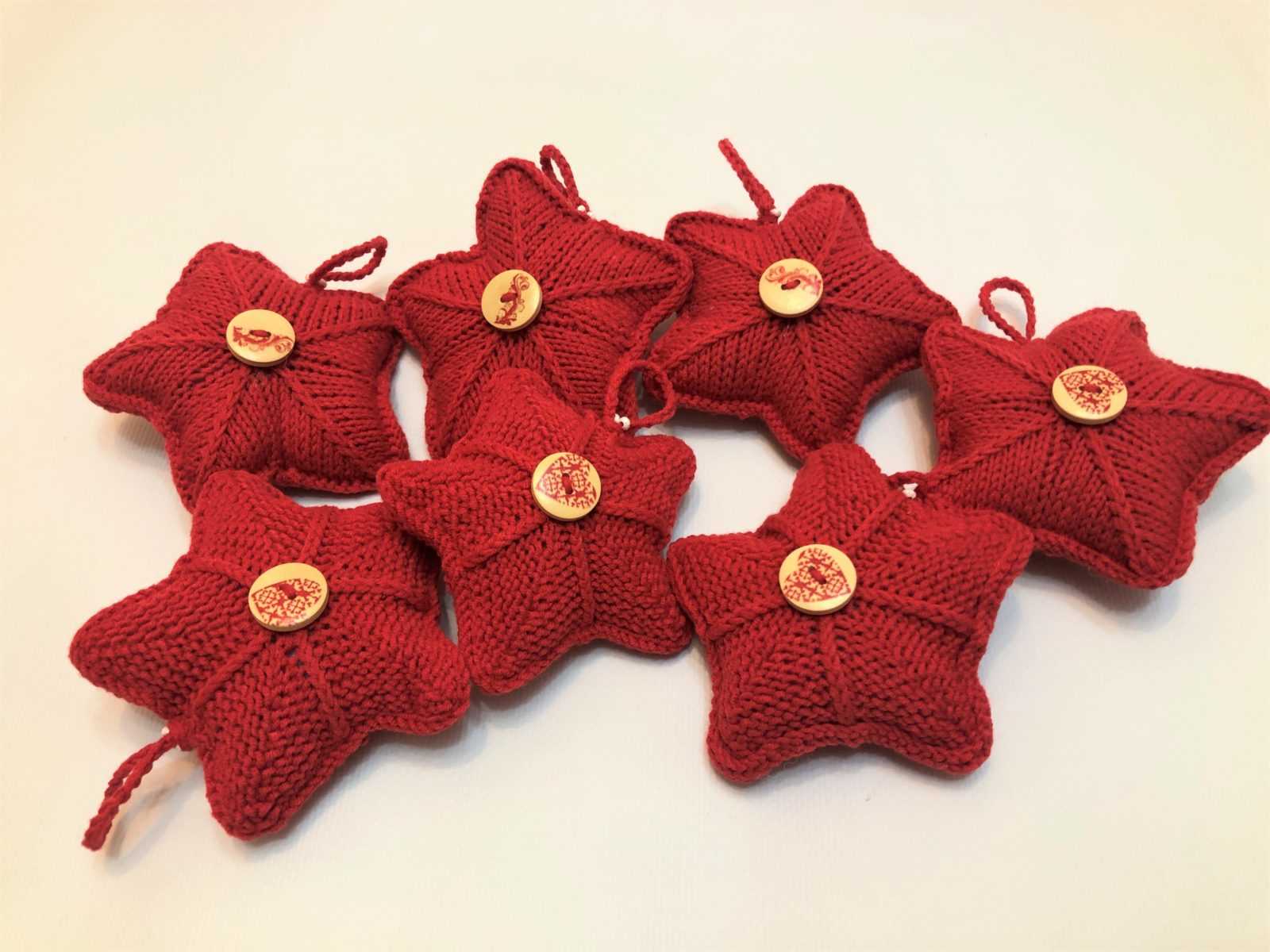 Здесь три звезды. На двух набрано по 10 петель для каждой спицы (10 х 5 = 50 петель). А на последней: по 12 петель. Эти звезды можно прикрепить к вязаной елке или другим новогодним изделиям.