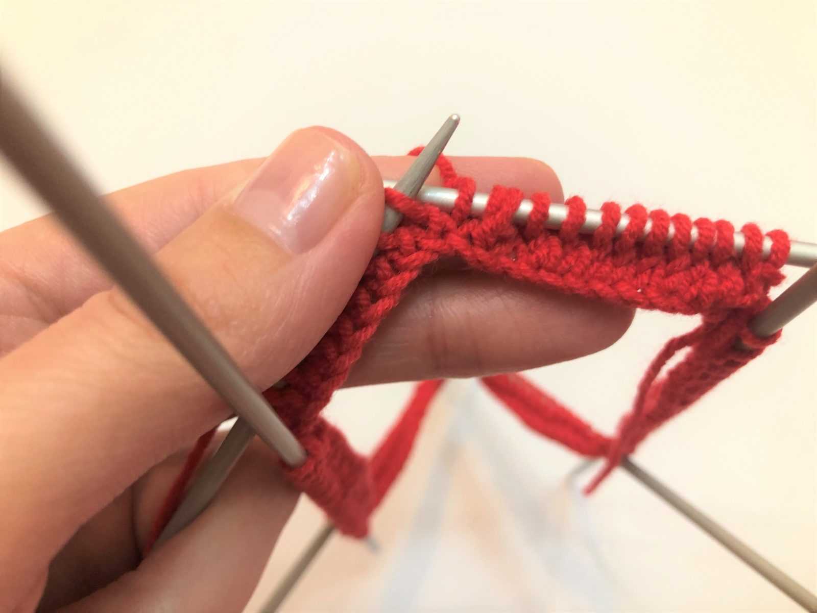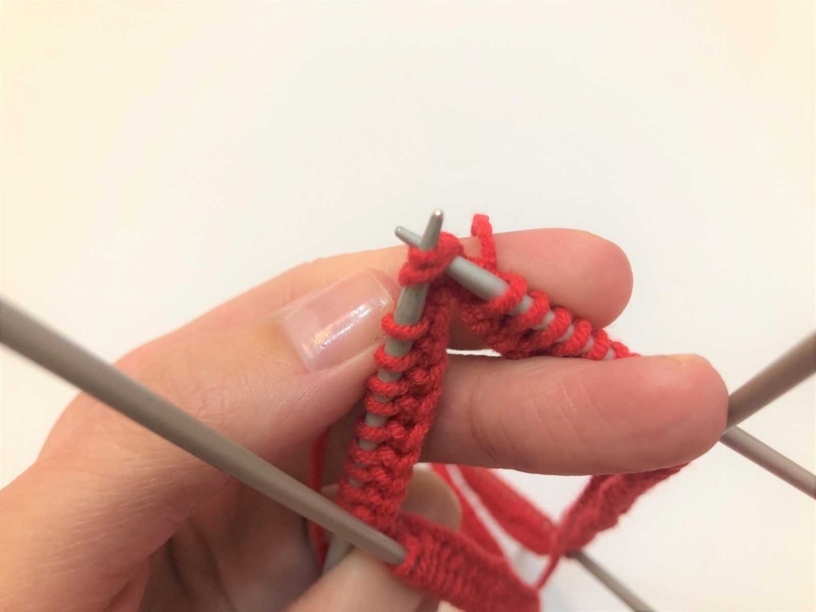 Затем кромка связанной детали нанизывается на спицу, и вязание продолжается по кругу с привлечением двух не задействованных иголок. Простая пятка готова, дальше вяжется изделие по кругу. Лишние петли убавляют в конце 1-ой спицы и в начале 4-ой в каждом втором ряду, пока их не останется одинаковое количество на всех 4-иголках. Дальше вяжется вкруговую лицевой вязкой до конца мизинца. Потом начинает вывязываться мысок.