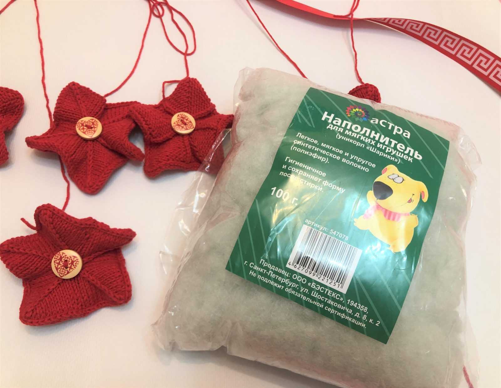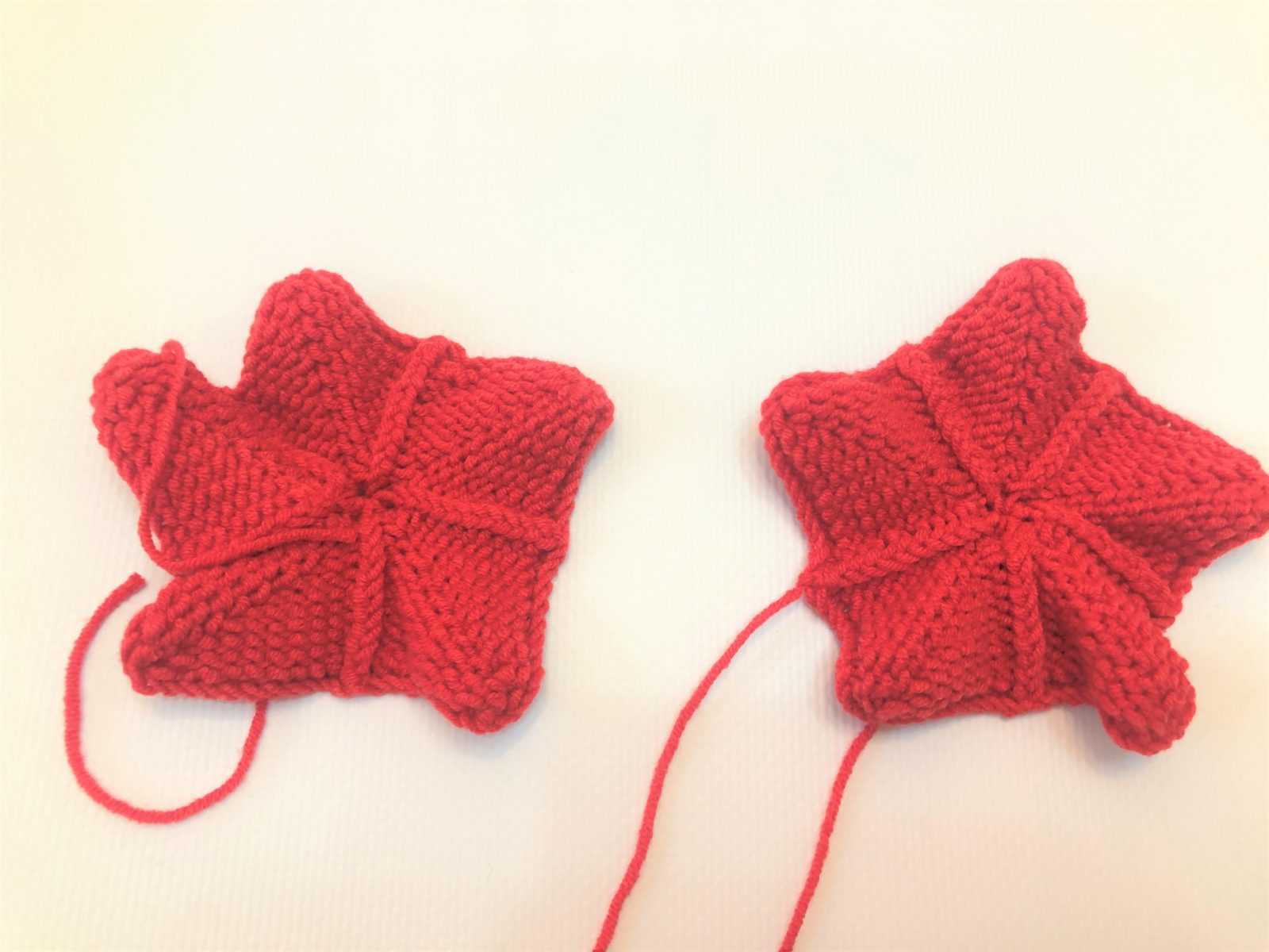 Сборка. Чтобы наполнитель не «просачивался» через дырочки в вязании, используем в качестве подкладки лоскуты стёганного одеяла (либо войлок, фетр). Вырезаем из подкладочного материала звёзды, которые по форме и размеру соответствуют нашим связанным. Следует учесть цвет подкладки, он не должен контрастировать с пряжей. Например, к светлой нити больше подойдёт белый фетр, а к тёмной – войлок.