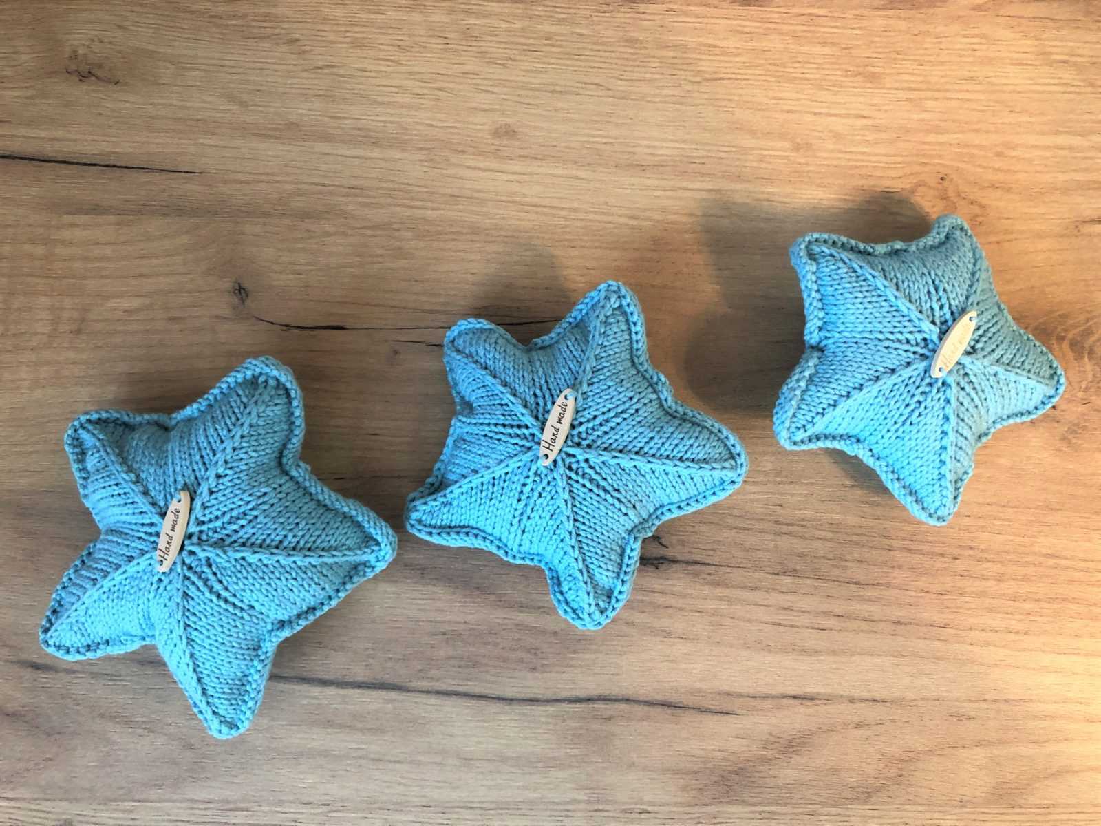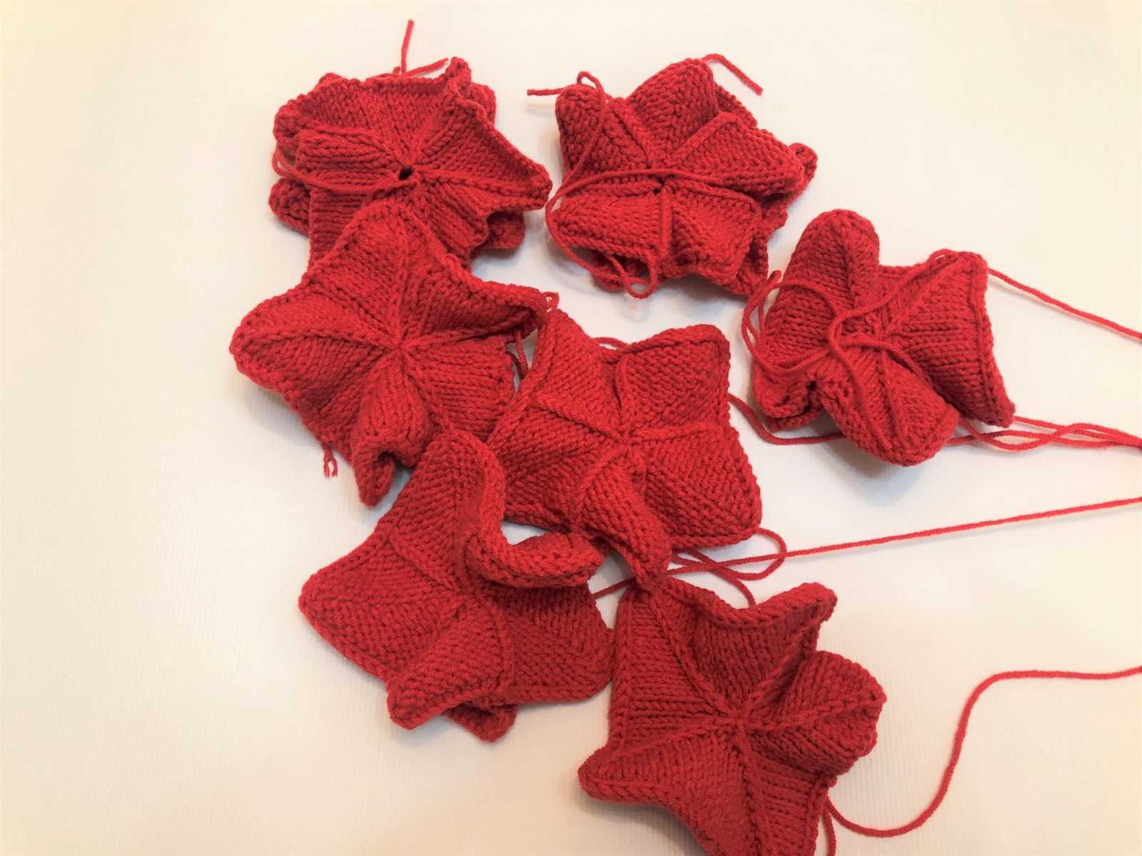 Я связала три звезды. 140 петель (по 28 петель на каждую из 5 спиц; 12/3/12, где 12 лицевых, 3 петли на убавления с помощью протяжки еще 12 лицевых. 1 изнаночная в начале спицы). 130 петель (11/3/11 — по 26 петель на спицу) и 120 петель (по 24 петли на спицу: 10/3/10).