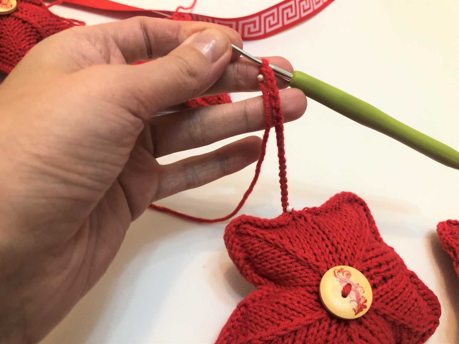 Затем отрезаем кончик, протягиваем оставшиеся петли с помощью крючка и закрепляем его на изнаночной стороне.