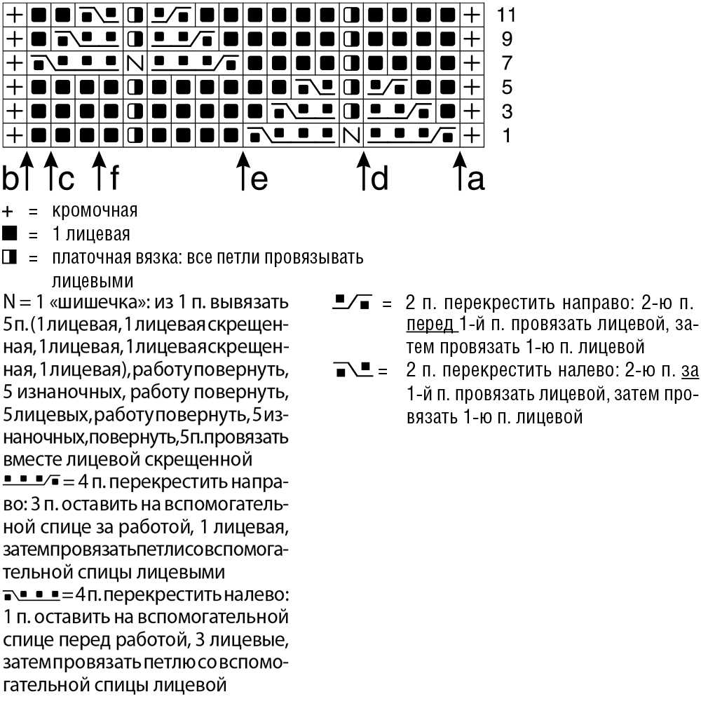 Норвежский узор: вязать по счётным схемам А — С лиц. гладью или по инструкции прямыми и обратными или круговыми р. в норвежской технике, нерабочую нить свободно протягивать по изнаночной стороне работы. Длинные протянутые нити время от времени перекрещивать с рабочей нитью. Повторять петли раппорта между стрелками а и Ь.