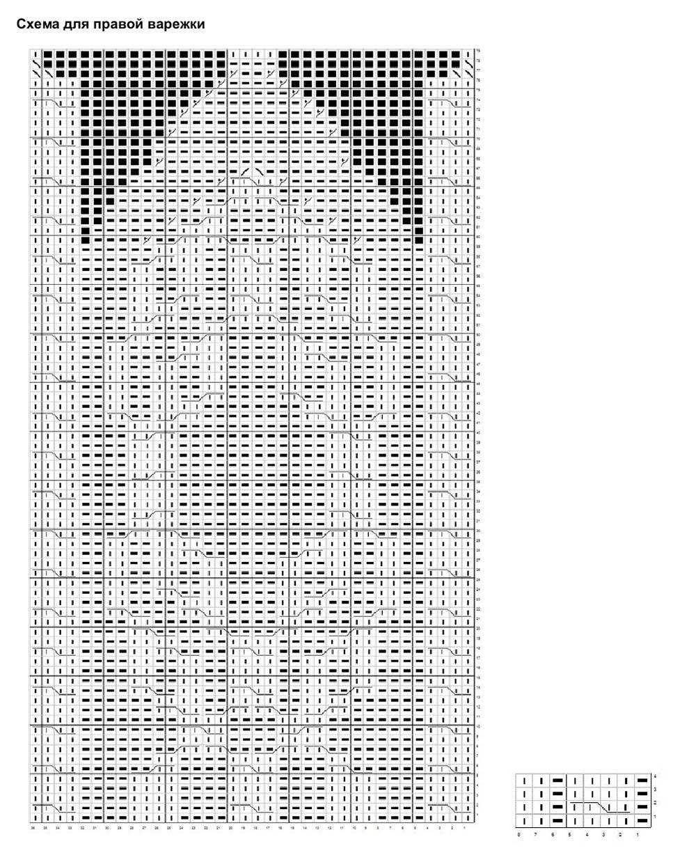 Правую варежку выполнять как левую, только запястье вязать по схеме кос с наклоном вправо и тыльную сторону – по схеме зеркальной косы с наклоном вправо.