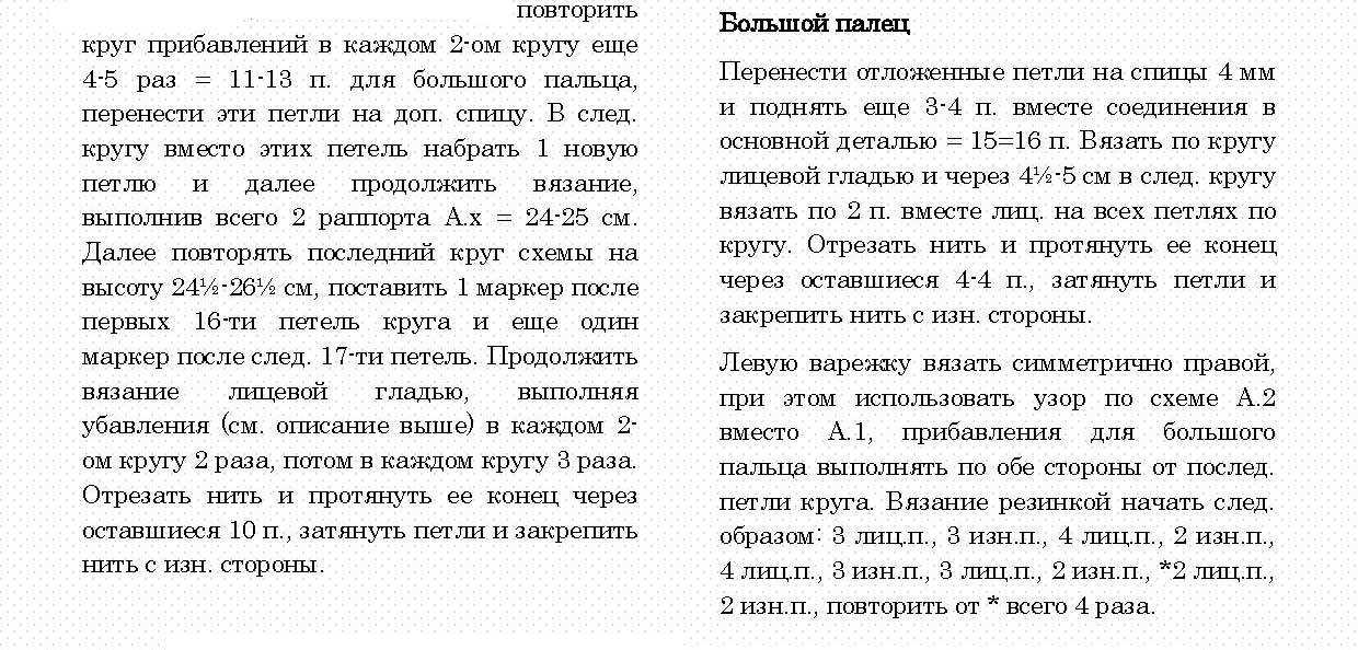 у меня где-то 10см — длина манжеты. в последнем ряду я убавила на каждой спице по 1 петле, провязав 2 вместе лицевыми в начале каждого ряда, после этого у меня на спицах осталось по 10 петель, всего 40(но это только для моего размера, все опытным путем, вязала без убавок все 44 петли получились где-то на обхват 20 см, пришлось распускать и делать убавления. Берем пряжу белую в 2 сложения и вяжем основную часть варежки. 4 ряда провязали, начинаем вывязывать клин большого пальца информация по вывязыванию есть в свободном доступе в интернете), я вязала так — права варежка — на первой спице провязала 4 петли затем прибавка — перекрещенный накид, 5-я петля и снова прибака, далее по кругу, след 2 ряда — без прибавок, след ряд с прибавками — 4 петли прямо, затем прибавка накид, затем уже 3 петли прямо, снова накид и остальноые петли прямо. След 2 ряда без прибавок. 5-я петли этой спицы всегда остается посередине. Через несколько рядов образуется клин — его видно и вязать легко. Для моего размера я сделала 6 рядов с прибавками + два ряда прямо (это только для моего размера, у вас может быть больше или меньшее количество прибавок).