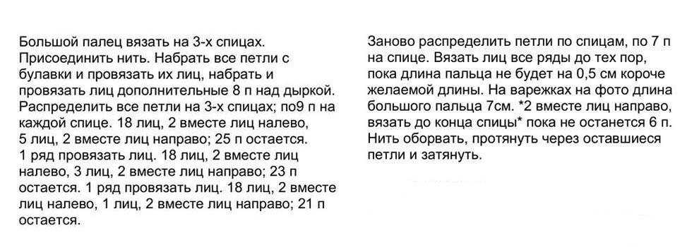 Для правой варежки отверстие для большого пальца вывязывается на 3-й спице, а для левой — на 4-й спице. На булавку снимите 5 (или сколько указано в инструкции) петель. Затем над снятыми петлями в следующем круговом ряду наберите столько же петель. Для вывязывания большого пальца поднимите петли с булавки и петли на противоположной стороне отверстия, дополнительно наберите по 1-й петле между ними. Полученные петли распределите на 3-х спицах и вяжите круговыми рядами лицевой гладью 4-й спицей. Вяжите до середины ногтя большого пальца, после чего выполните убавления — в каждом круговом ряду провязывайте 2 последние петли каждой спицы вместе лицевой. Оставшиеся петли стяните рабочей нитью. Нить отрежьте, закрепите и спрячьте внутри пальчика.
