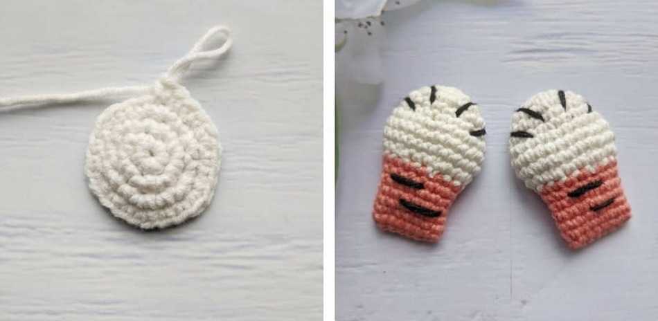 Перед провязыванием последнего рядка, набейте лапки ватином или же синтепоном. Для удобства применяйте карандаш. Оставьте небольшой конец для пришивания лапок к деталям тигра.