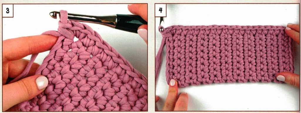 - Провязать 2 СБН, повторить четыре раза. Две петли должны остаться свободными. Ввести крючок с обратной стороны и повернуть работу.