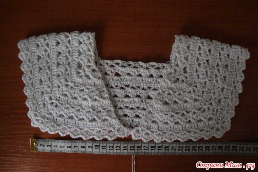 Продолжаем вязание до тех пор, пока длина изделия не станет прикрывать спинку и грудь.Важный момент: начальное количество воздушных петель часто правильно рассчитать сложно. Рекомендуем поступить следующим образом – набрать количество петель с запасом. Связать первый ряд по узору. Затем оставшийся хвостик из воздушных петель начальной цепочки обрезать, распустить пару петель и завязать. Таким образом, пару сантиметров пряжи уйдет в расход, но время рукодельнице, а также нервы, сэкономит.