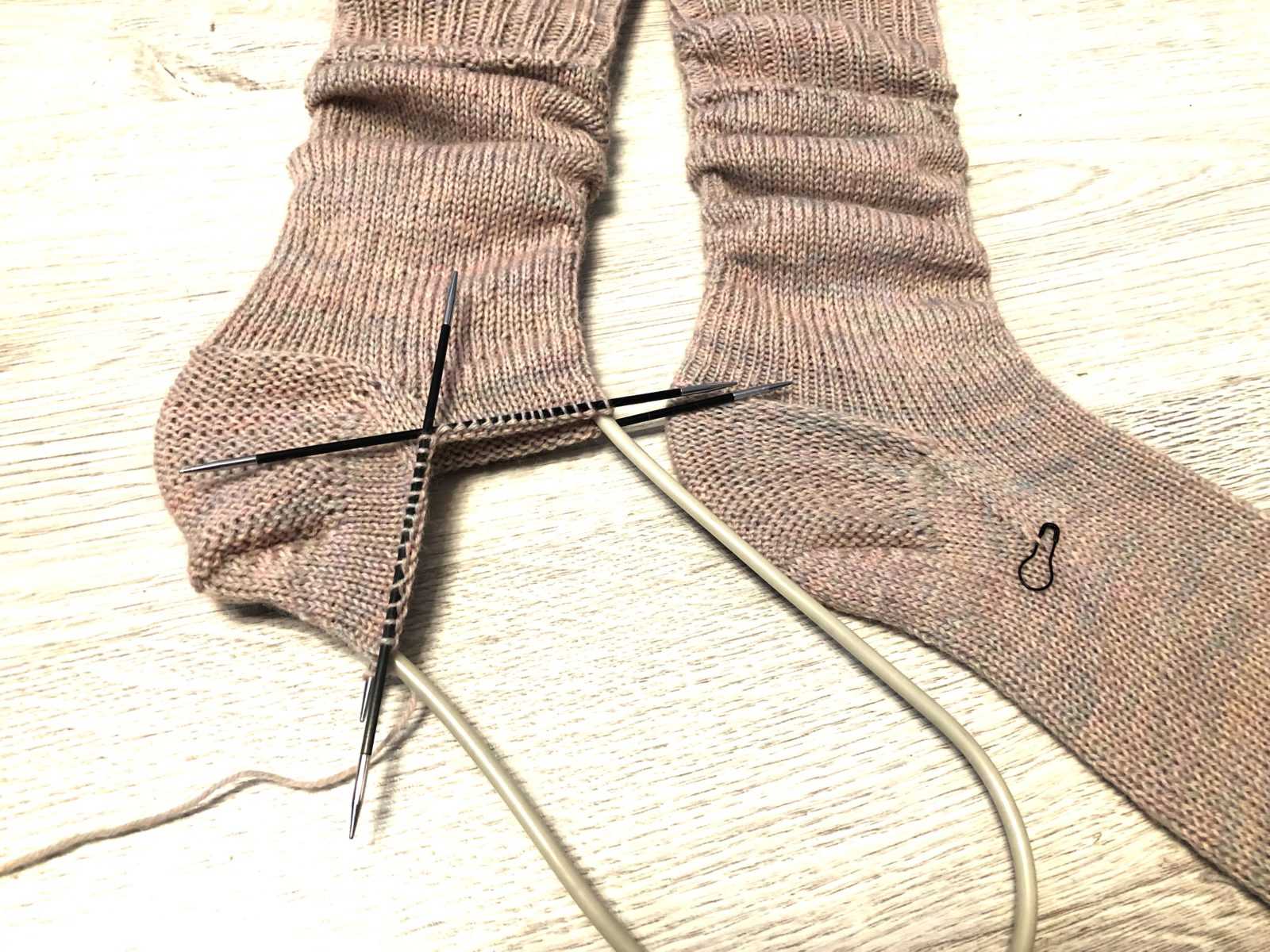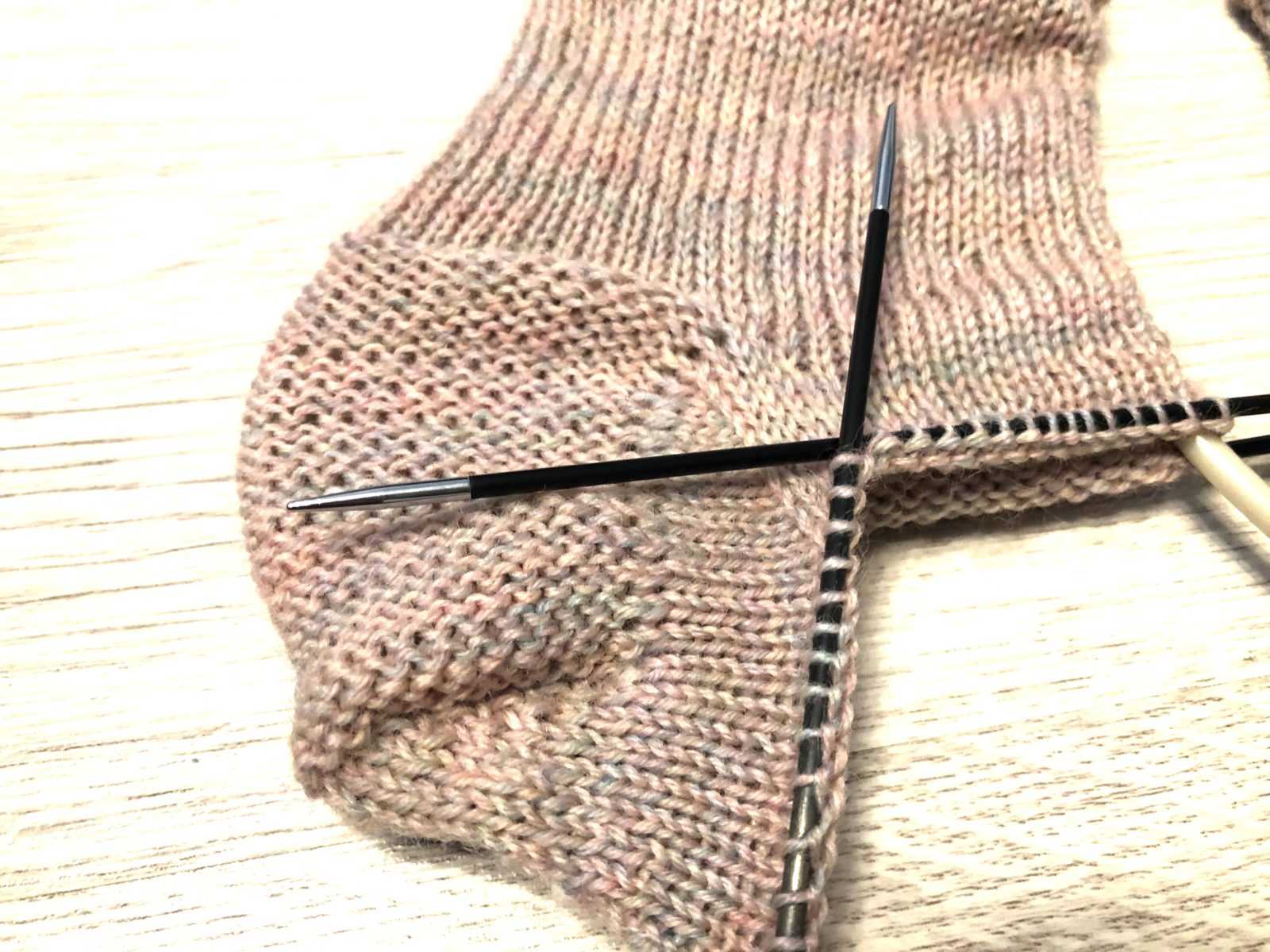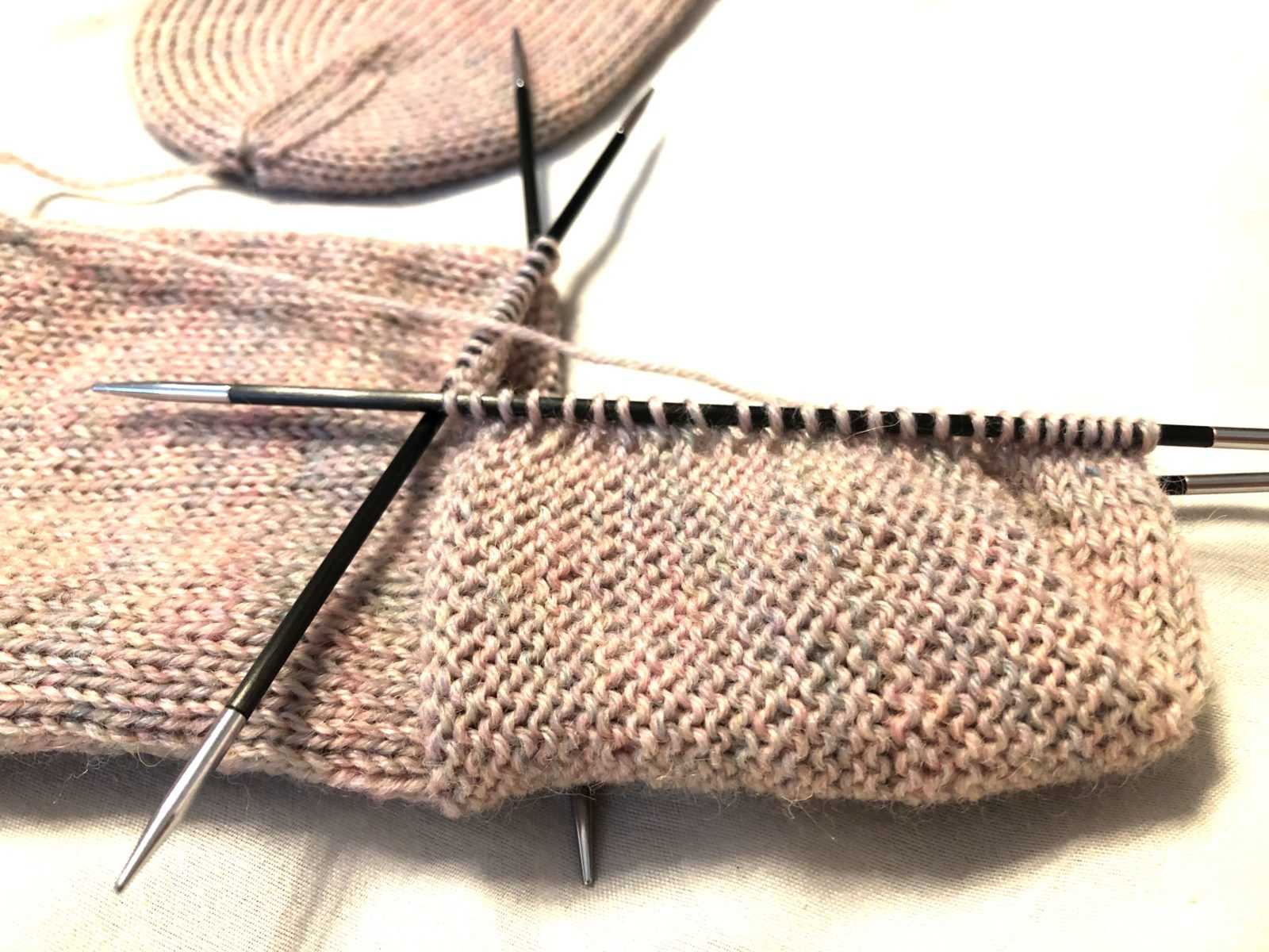 - Провязав 97 рядов (42 см) перераспределяем петли на 4 спицы по 12,9,16 и 12. На первой и четвертой будет лицевая гладь. Для пятки добавляем пряжу из полиэфира. Пятка вяжется методом «бумеранг», когда в укороченных рядах с каждой стороны не довязывают по 1 п., выполняя накид на правую спицу. Должно остаться 10 п. Затем вяжутся удлиненные ряды – по 1 петле с каждой стороны переносим на правую спицу, туго затягивая нить.