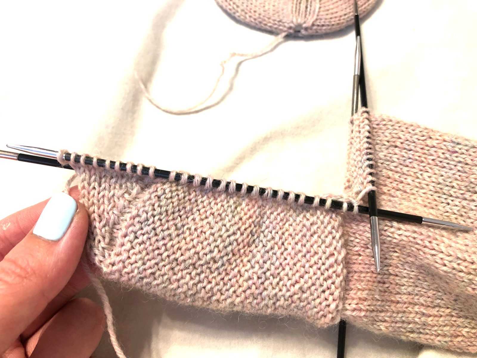 Набрать 76 п. Если используются чулочные спицы, равномерно распределить петли между спицами. Поместить маркер и вязать по кругу. Вязать резинкой 2×2 пока работа не достигнет 7,5 см.