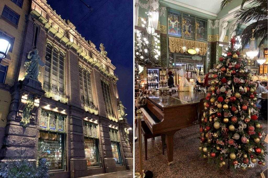 На углу Малой садовой и Невского проспекта, как раз где начинается ярмарка на Манежной, находится знаменитый магазин Купцов Елисеевых. Можно сказать, что это продовольственный магазин-музей с одной из самых красивых витрин в Санкт-Петербурге. Обычно там делают «селфи».
