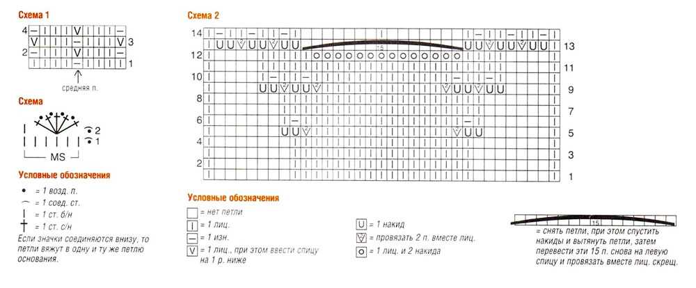 Годе из 9 п: вязать по схеме 1. На которой приведены лиц. и изн. р. Связать 1 раз с 1-го по 4-й р., затем повторять 3-й и 4-й р.