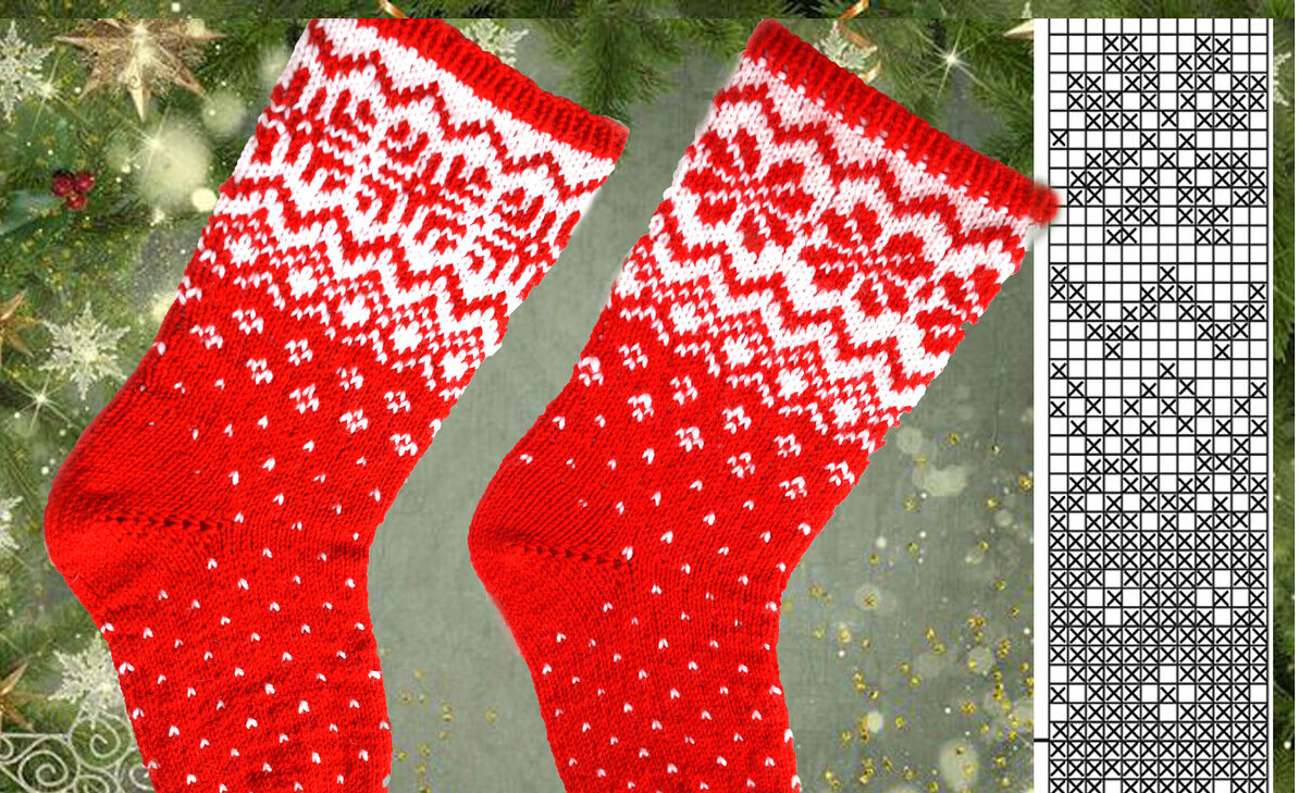 Всё что касается Нового года и Рождества — может быть использовано в схемах по созданию носочков: Дед Мороз, Снегурочка, снежинки, сугробы, ёлки, весёлые олени и много другого волшебства.